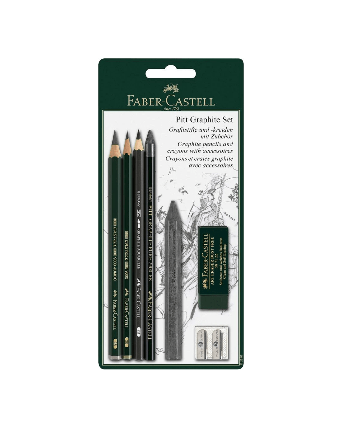 - This 7 piece set includes 1 2B jumbo pencil, 1 2B graphite pencil, 1 2B aquarelle pencil, 1 6H pure lead pencil, a graphite crayon, an eraser and a sharpener.