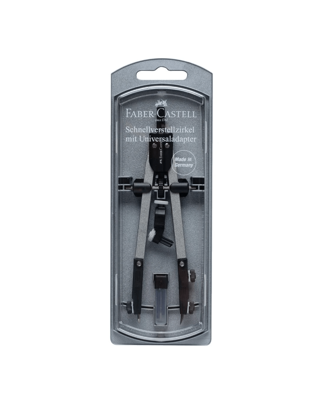 Draw accurate lines with this Faber Castell Quickset Compass. This compass comes with robust gear wheels, perfectly engineered central wheel spindles as well as easily adjustable legs and non-slip needles. The universal adapter fits pencils, pens and even mechanical pencils so you can sketch with your favourite tool.
