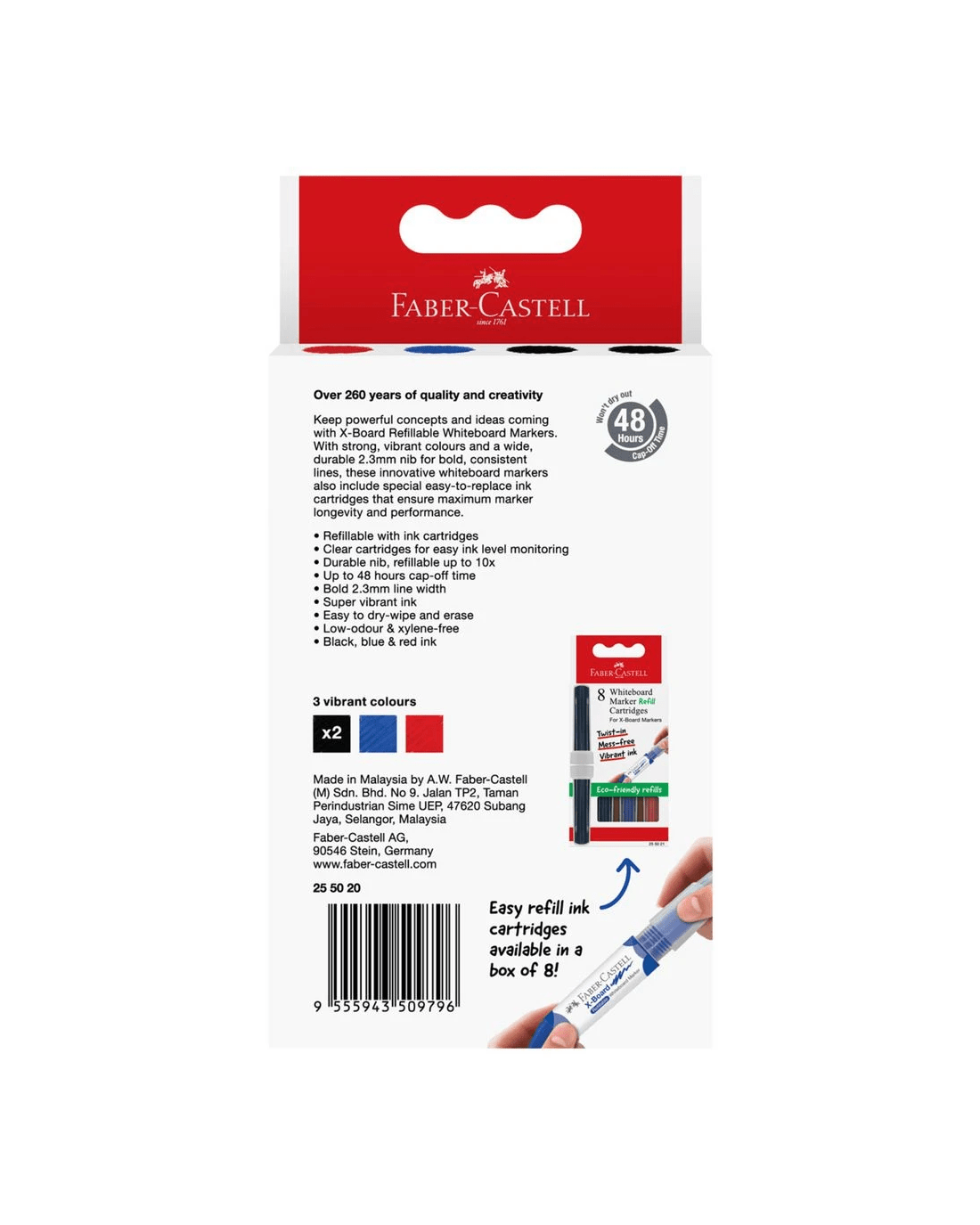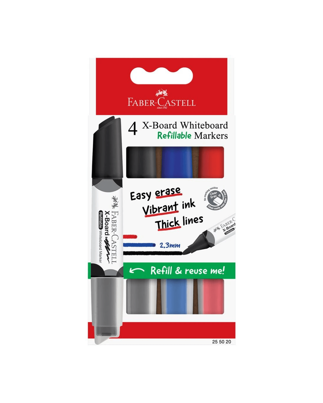 The Faber-Castell Whiteboard Markers are designed for comfortable handling and clear, highly legible writing in everyday office or classroom use. Featuring an ergonomic triangular barrel and smooth, bright ink flow, they allow effortless writing and clean erasing without ghosting. With durable construction and innovative ink delivery, they offer dependable performance from the first stroke to the last.