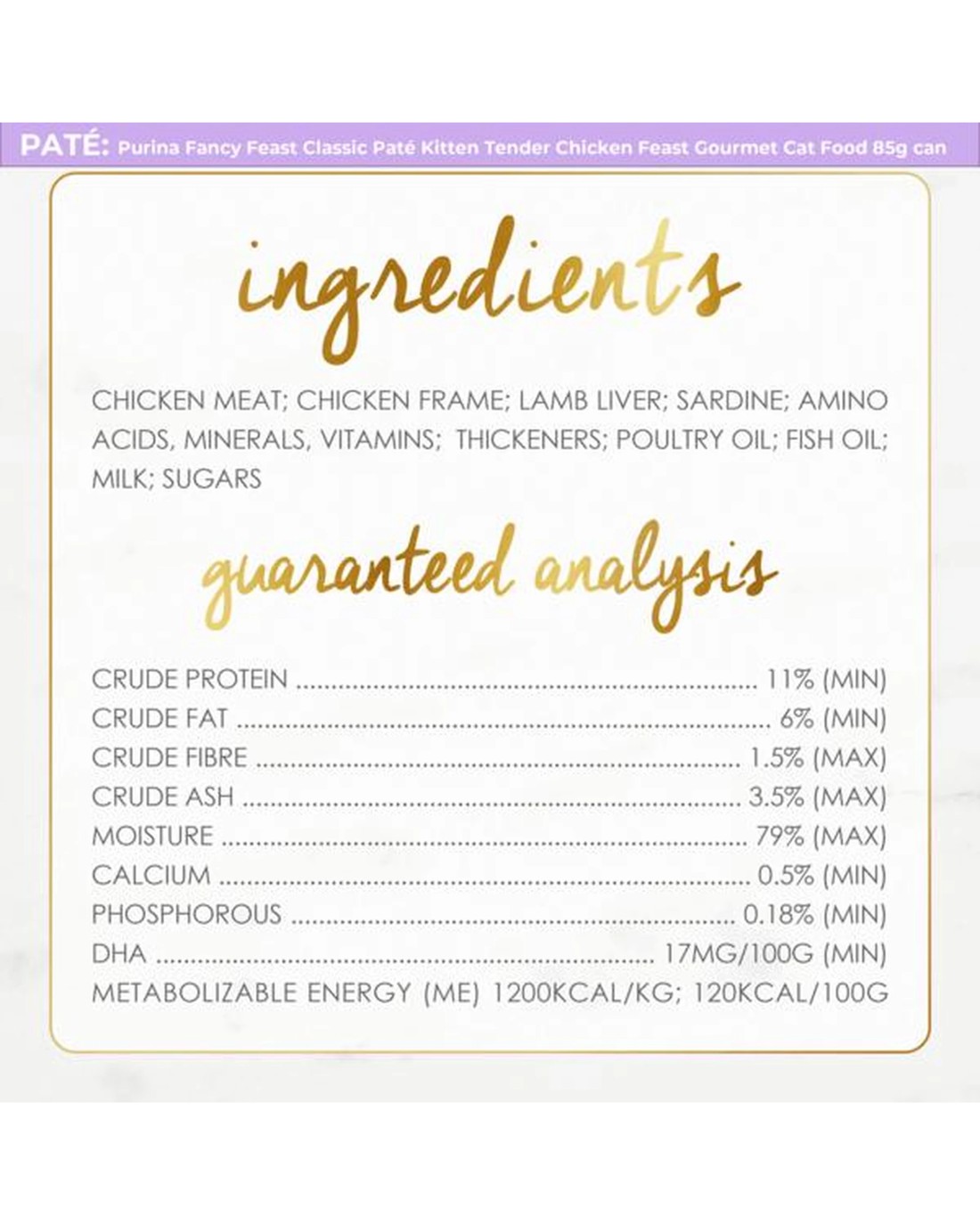 Start your kittens love of gourmet foods early with Purina Fancy Feast Kitten Chicken Feast wet cat food. A deliciously smooth paté with real, high-quality Chicken, made with real milk, specially for kittens.