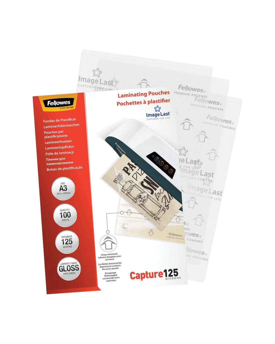 Sold by OfficeworksFellowes A3 125 Micron Laminating Pouch Gloss 100 Pack