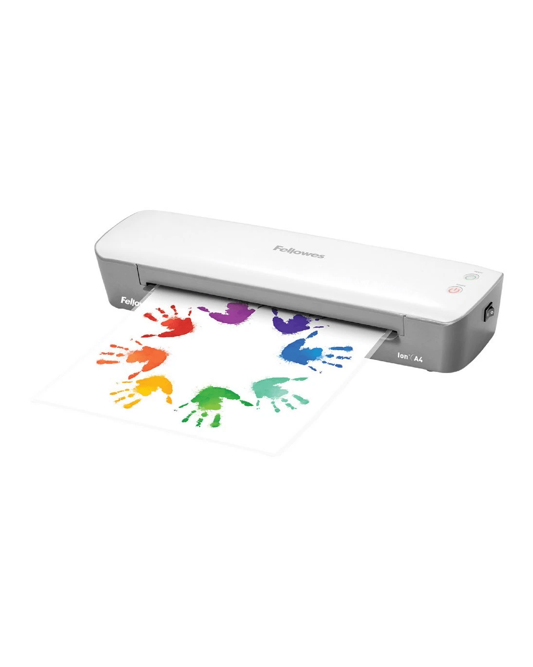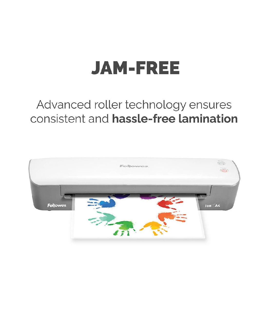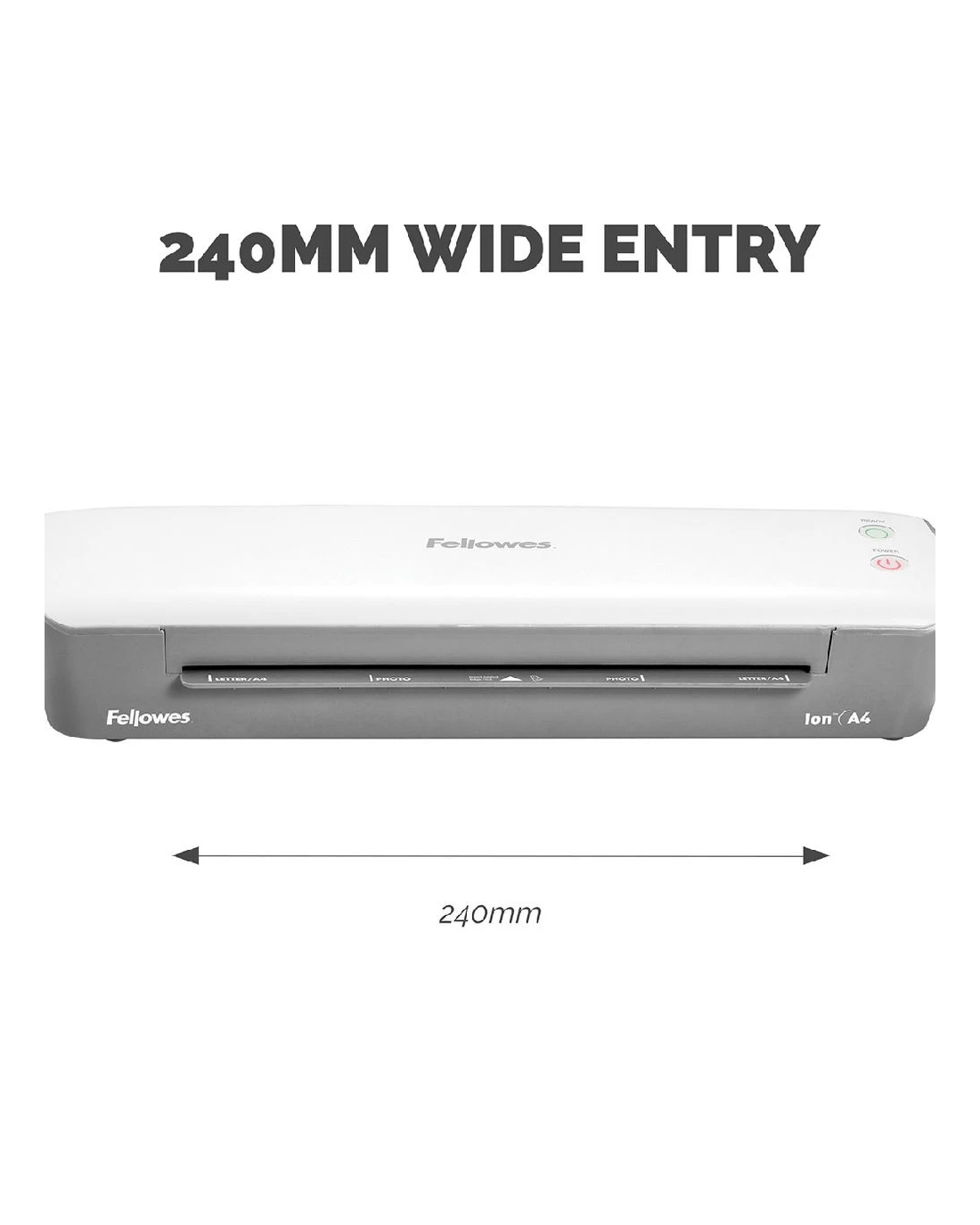 This Fellowes A4 Ion Laminator is ideal for keeping your documents protected. It comes with a Jam Release mechanism to prevent paper jams if documents are fed incorrectly plus an auto shut off feature to help save power. Get laminating today with the fast 4 minute warm up time and included 10 pouches.