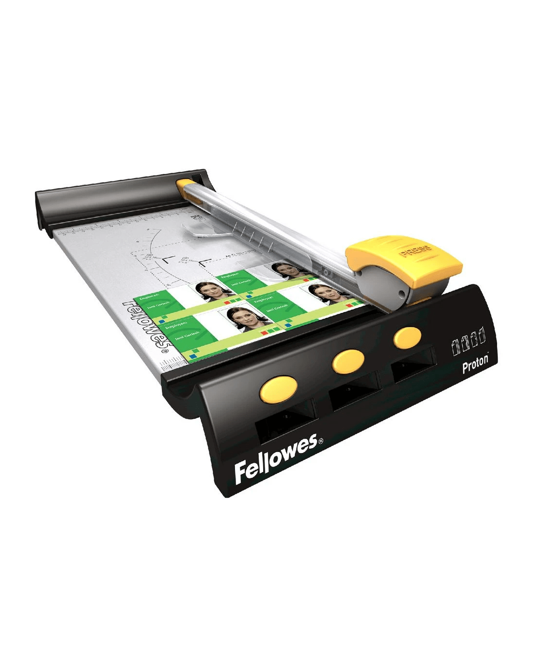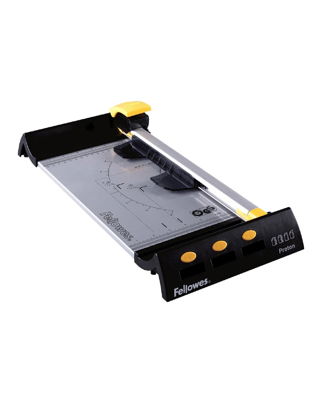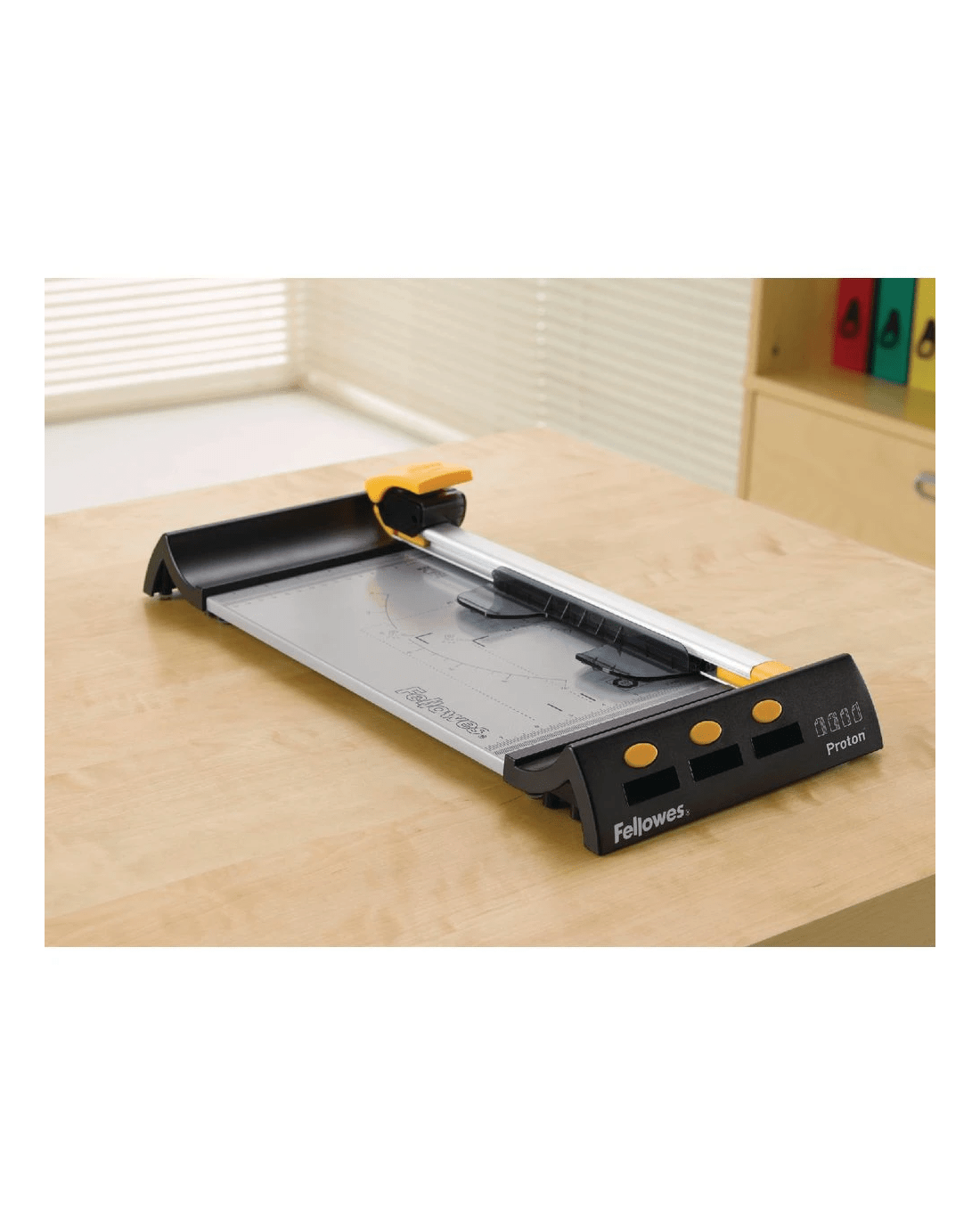 The Fellowes Proton Paper Trimmer has a sharp, stainless steel blade so you can cut paper accurately. It comes in a handy A4 size and can cut up to 10 sheets (80gsm) at a time, making it ideal for use in the home office. Its unique SafeCut blade cartridges protect the stainless steel blade so it is only exposed when trimming, ensuring maximum safety and easy use.