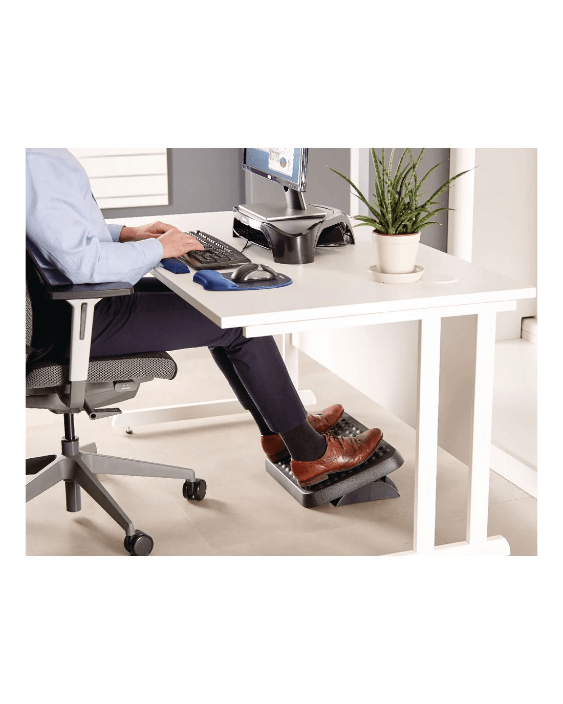 The Fellowes Standard Adjustable Footrest offers dual-position height adjustment and a free-floating platform so you can raise it to a level that's comfortable for you. It also features a textured surface to massage your feet and to relieve pressure while you work.
