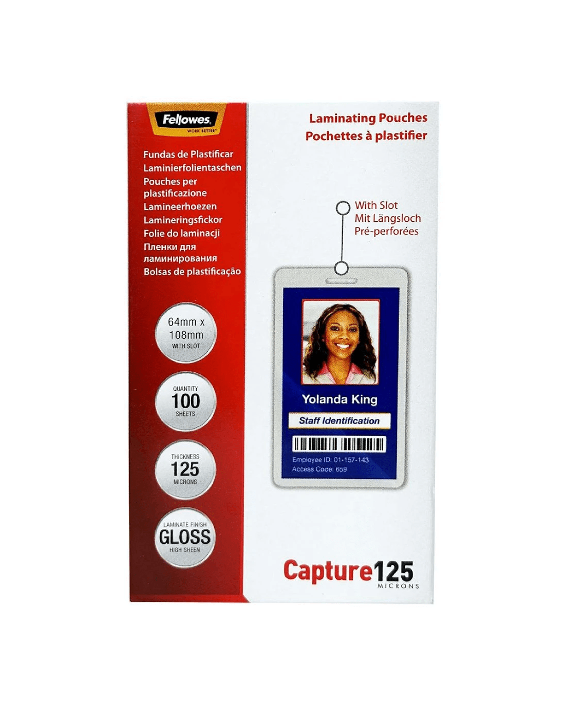 Sold by OfficeworksFellowes Laminating Pouch 64x108mm 125 Micron Gloss 100 Pack
