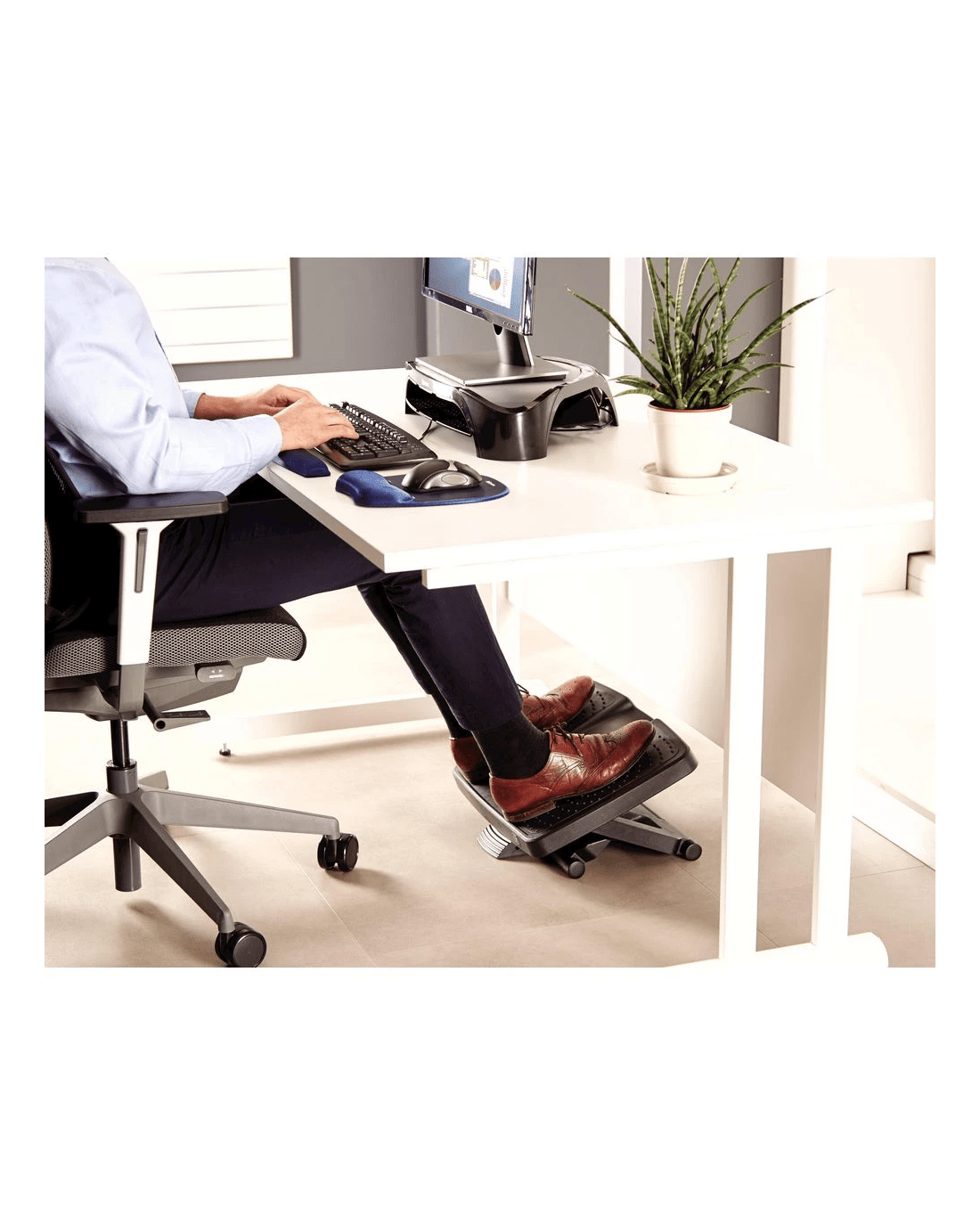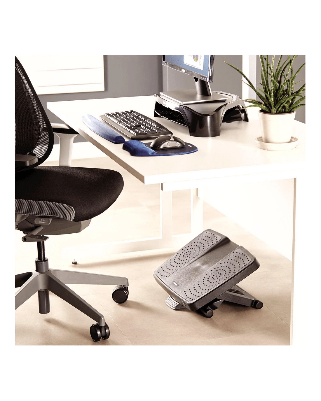 The Fellowes Professional Ultimate Footrest features both a textured and a smooth surface to help relieve pressure. It features a scissor motion height adjustment so you can elevate your feet and legs to your desired height. It's ergonomically designed so that your feet remain in the correct position while the lack of fixed angle improves circulation.