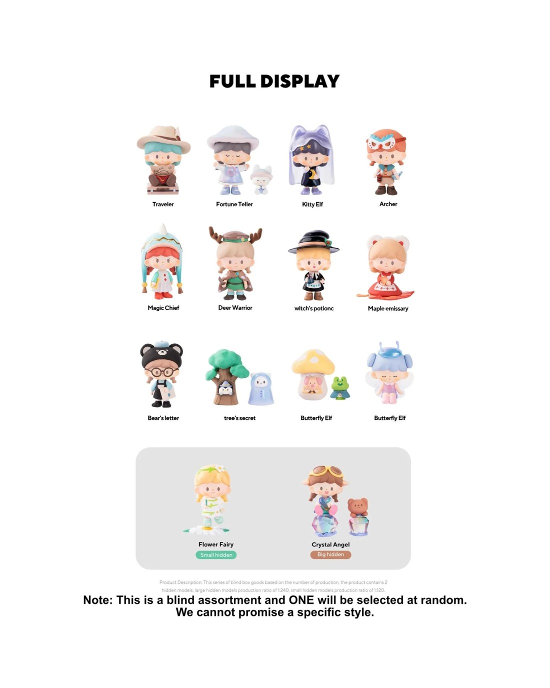 Unveil the wonders of the magical forest, where enchanted crystals hold the power to foresee the future! Join Azhuo on an epic quest to uncover these hidden treasures. As you wander through the enchanting woods, the twisted branches weave a tapestry of mystery and magic. With every fluttering butterfly and vibrant maple leaf guiding your path, you'll find the crystals awaiting discovery. Fear not, for the elves and guardians of the forest are here to assist you on this extraordinary journey. Slip on your invisible night cat cloak and embark on a thrilling adventure in this enchanted wonderland! Your destiny awaits—are you ready to explore? There are 12 regular and 2 rare types of figure to find, which one will you discover? Ages 15 +Contents