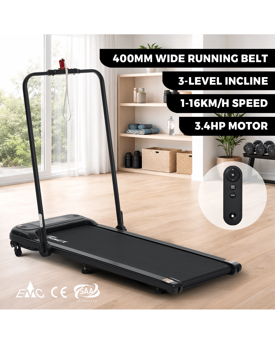 With its 400mm wide treadmill belt that is both durable and anti-slip, using the treadmill is convenient with ample space to walk up to 12km/h or run up to 16km/h. Its flat design also makes for comfortable exercising with an option of a 3-level inclination for more challenging workouts.