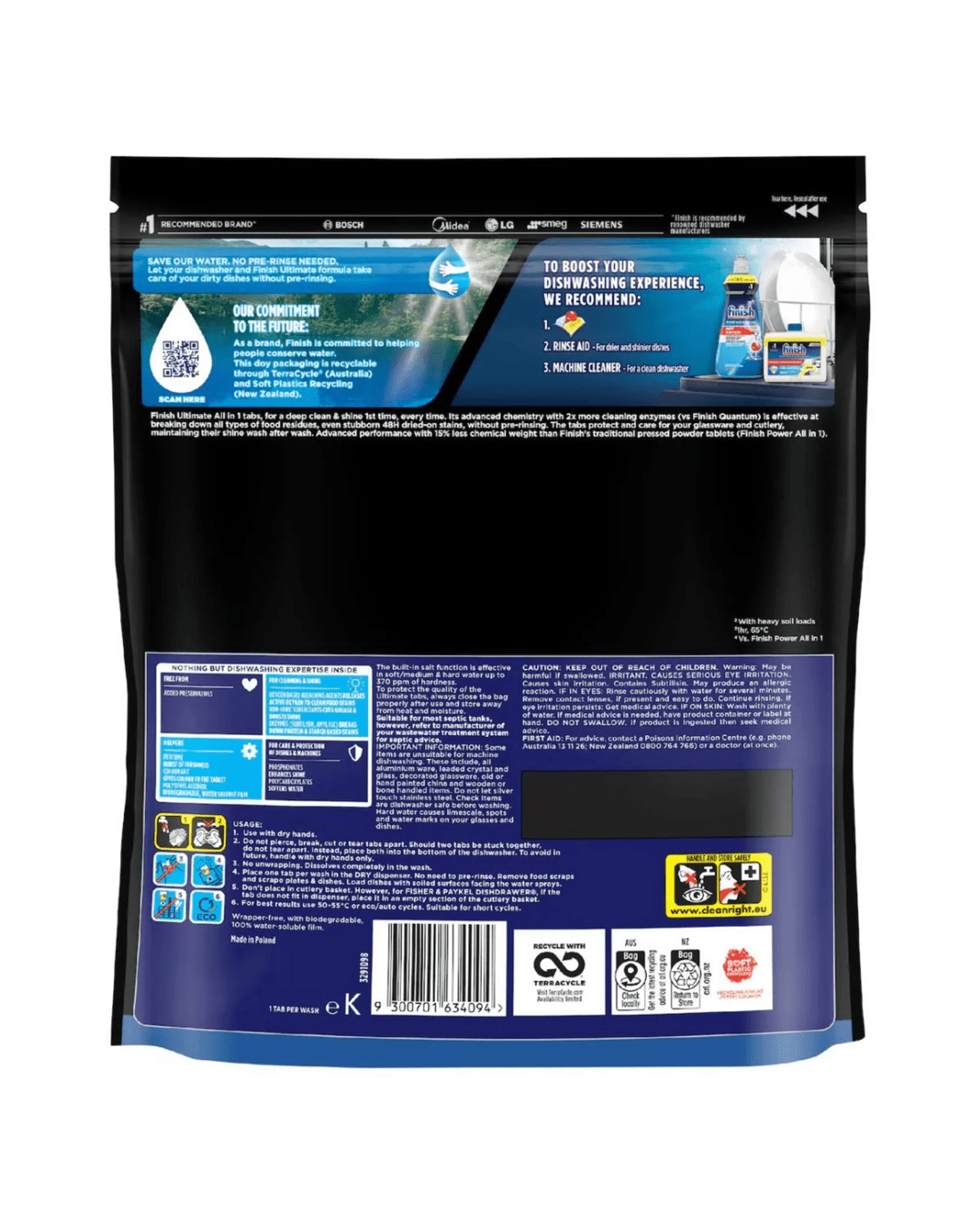 Finish Ultimate Dishwashing Tablets offer a powerful deep clean designed to tackle all types of food residues, including stubborn 48-hour dried-on stains, without the need for pre-rinsing. The fast-dissolving formula works effectively in short (1 hr, 65°C) and eco cycles, cutting through grease while protecting glassware and maintaining long-lasting shine. Each tablet is wrapper-free, using a 100% water-soluble, biodegradable film for an effortless and environmentally considerate wash.