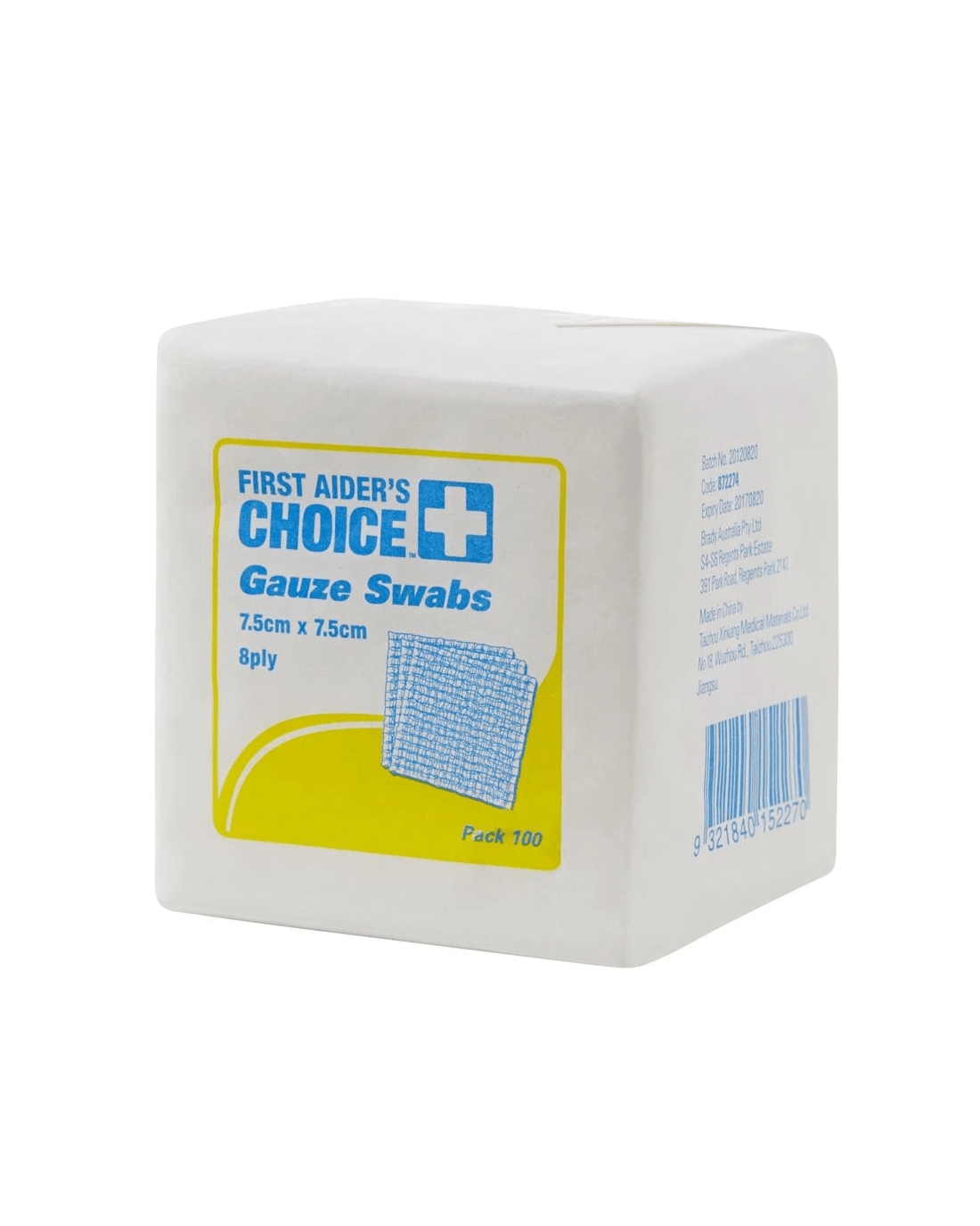The First Aiders Choice Non-Sterile Gauze Swabs are helpful in a wide variety of first aid situations. The gauze swabs are 7.5 cm in size, 8 ply thick and can be stacked to cover a larger area.