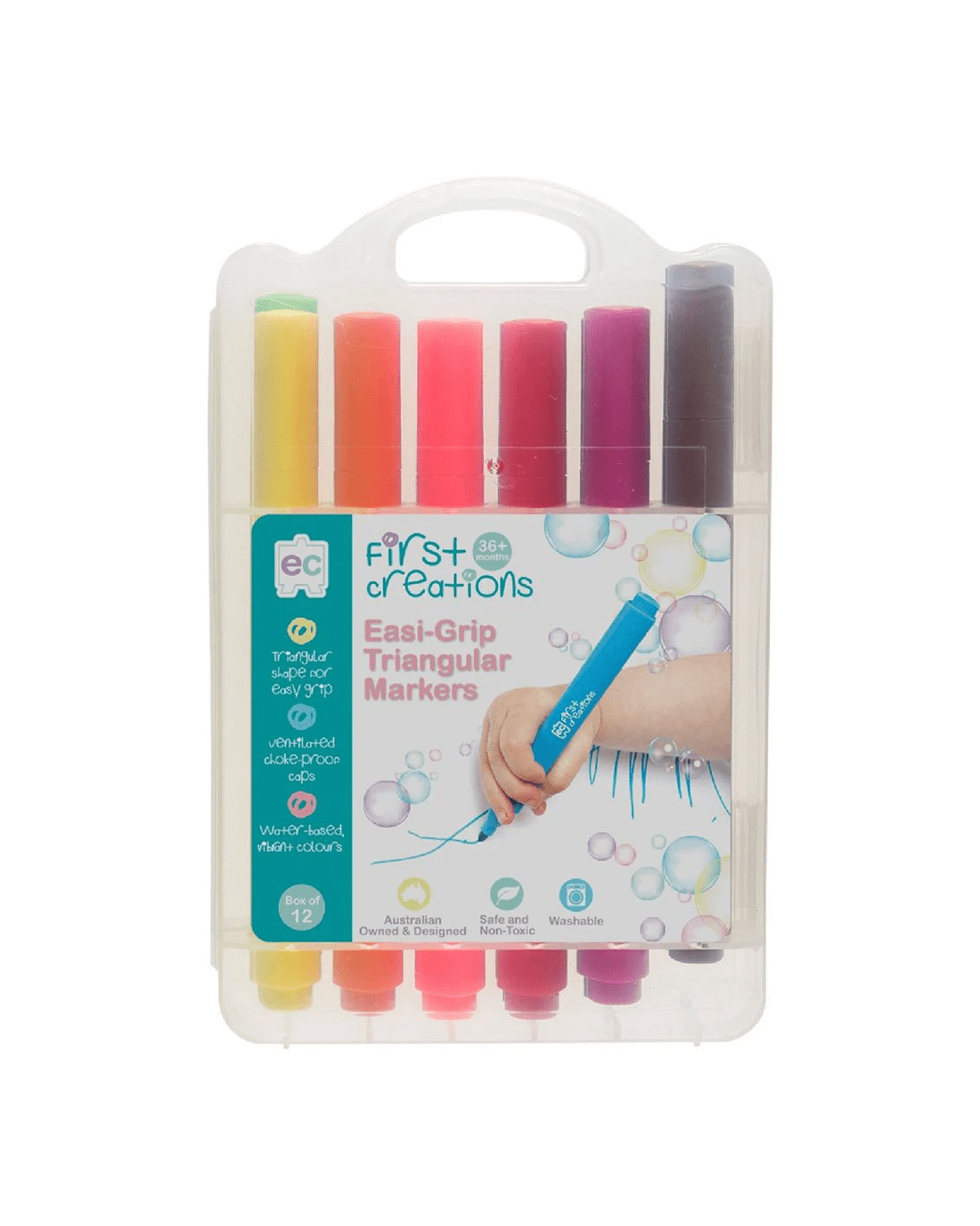 These First Creations Easi-Grip Triangular Markers are designed to be easy and safe for early learners to use. They have a triangular, easy to grasp barrel, contain washable ink and are non-toxic for your safety.
