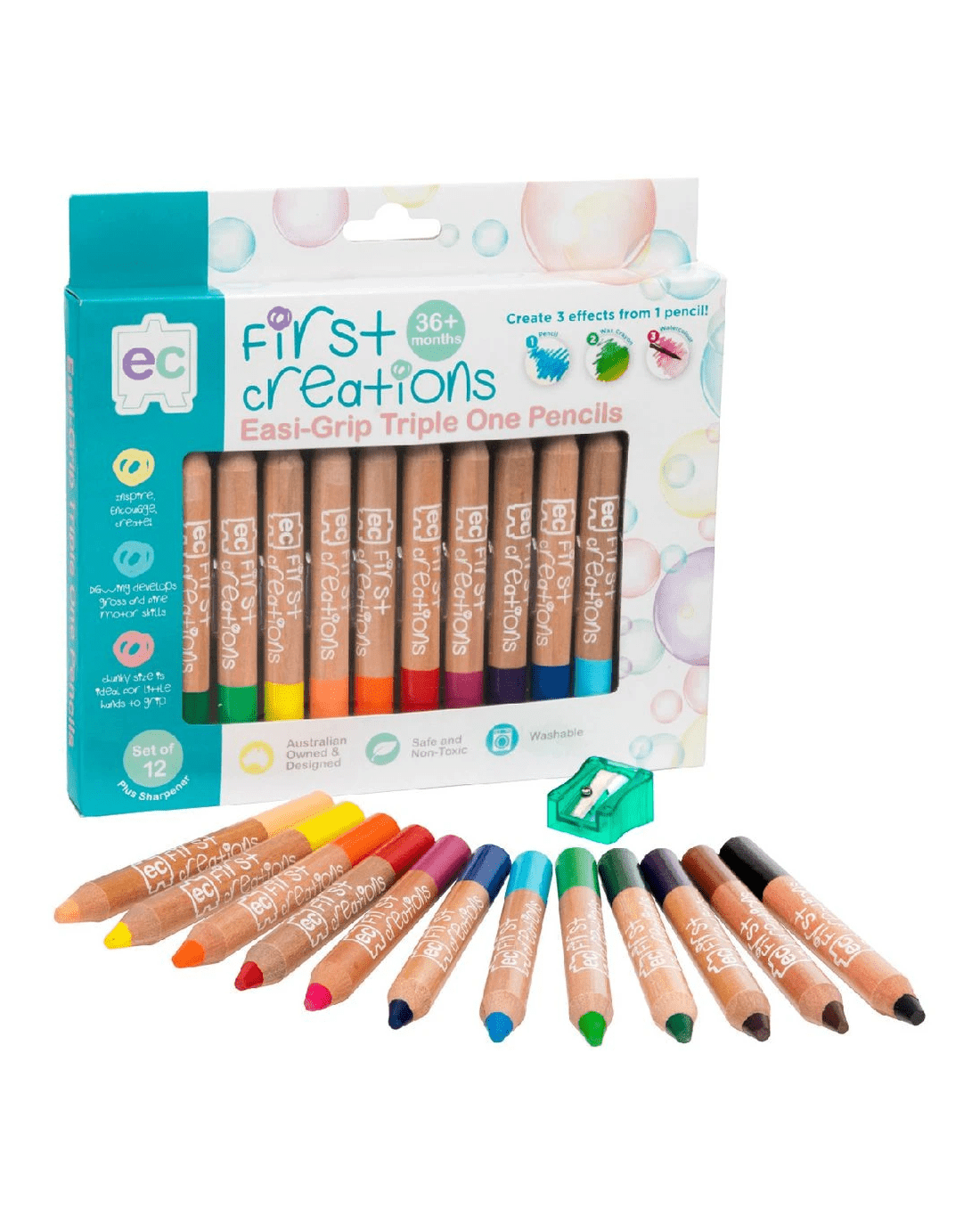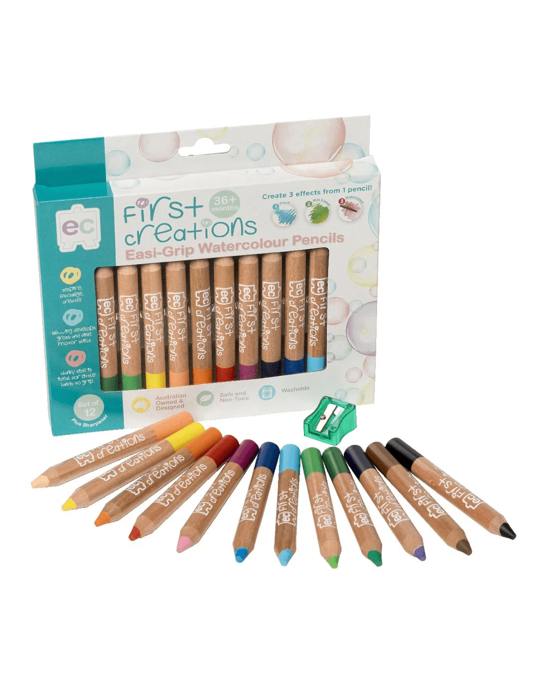 These First Creations Easi-Grip Pencils have a 3-in-1 design meaning they can be used as watercolour pencils, coloured pencils or wax crayons. Each pencil has a chunky wooden barrel and contains highly pigmented lead that's break-resistant for added durability. The colours apply smoothly, are blendable, water soluble and provide high coverage.