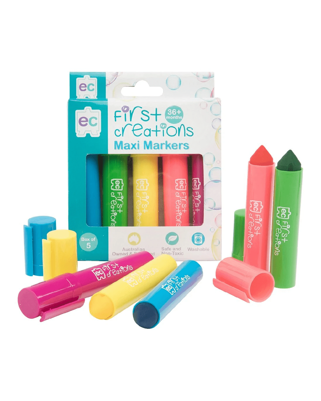 These First Creations Maxi Markers are large and chunky in size making them ideal for small hands to grip and hold during use. Each marker contains non-toxic washable ink and features a ventilated cap to prevent choking. They have sink proof nibs that can be applied to paper in a variety of angles to create thick, broad strokes or fine lines.