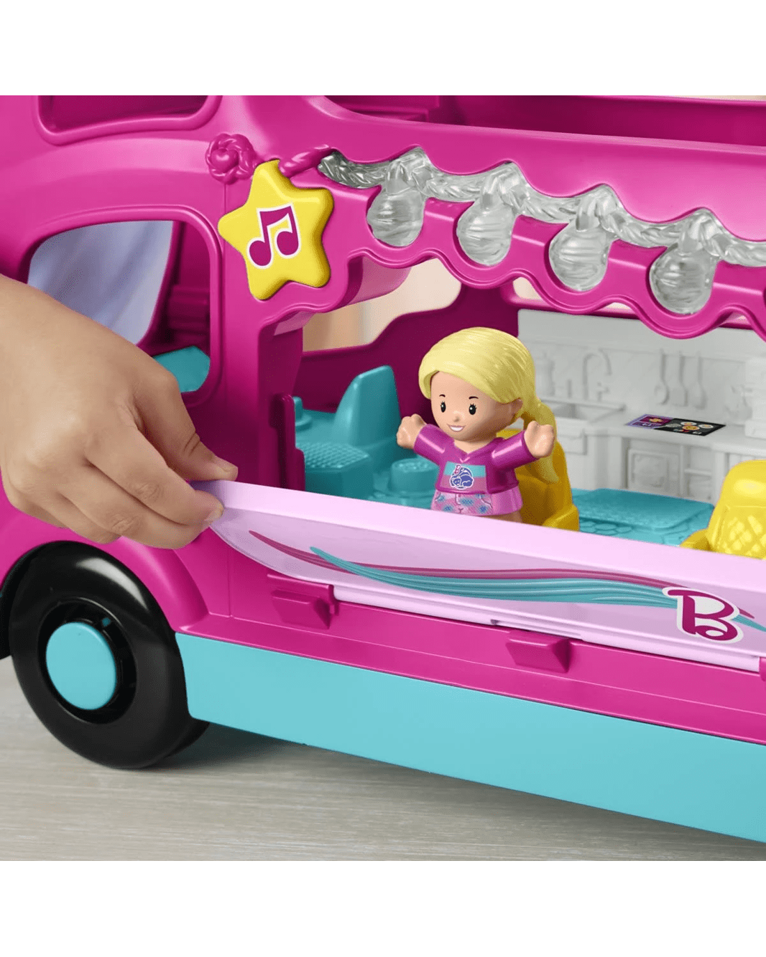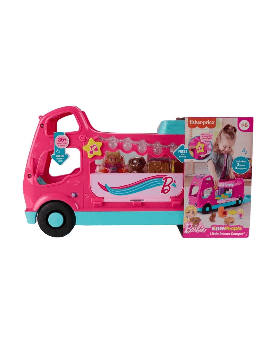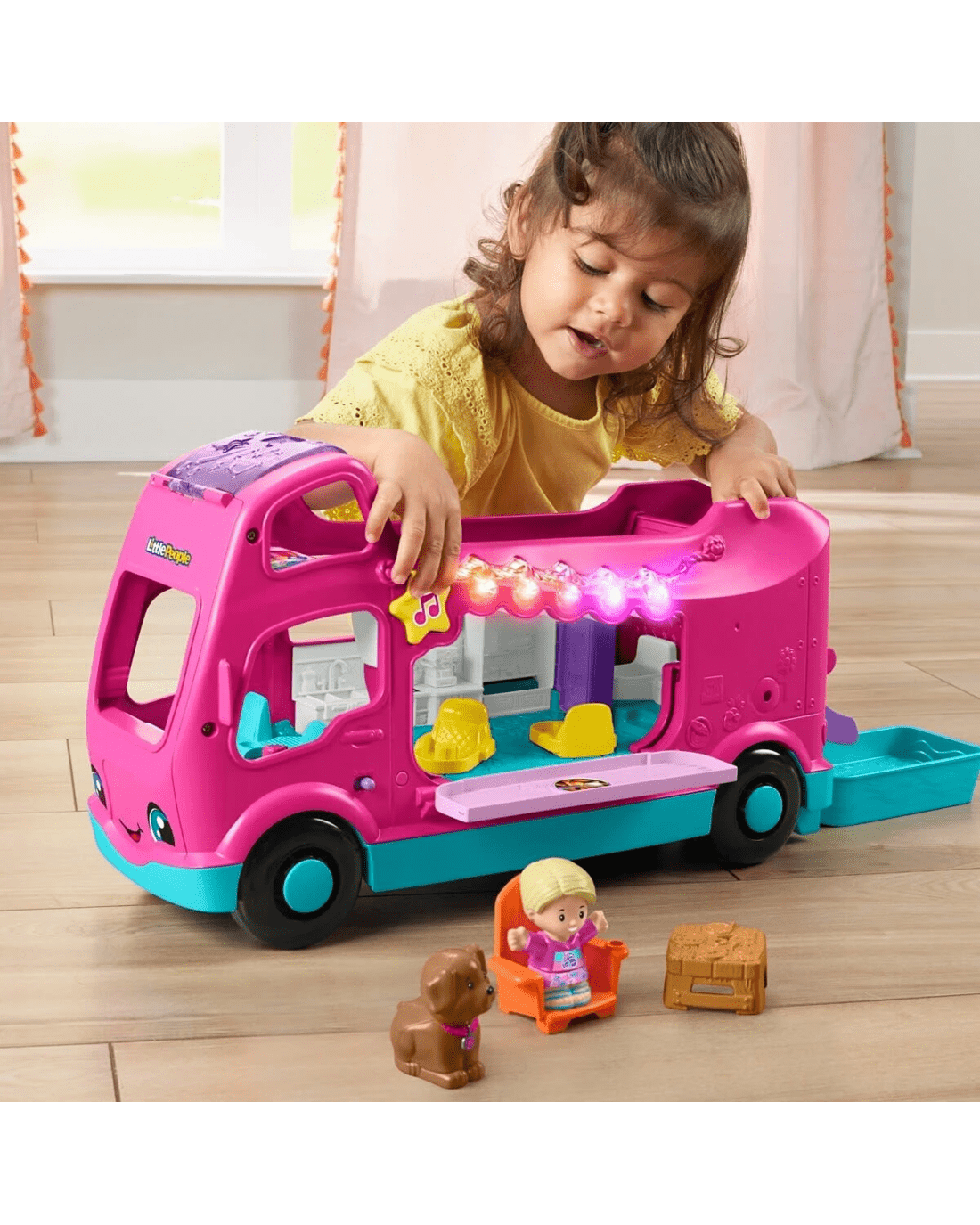 Features- Toddlers can embark on Barbie-themed camping adventures with this musical push-along RV that opens into an interactive Little People playset