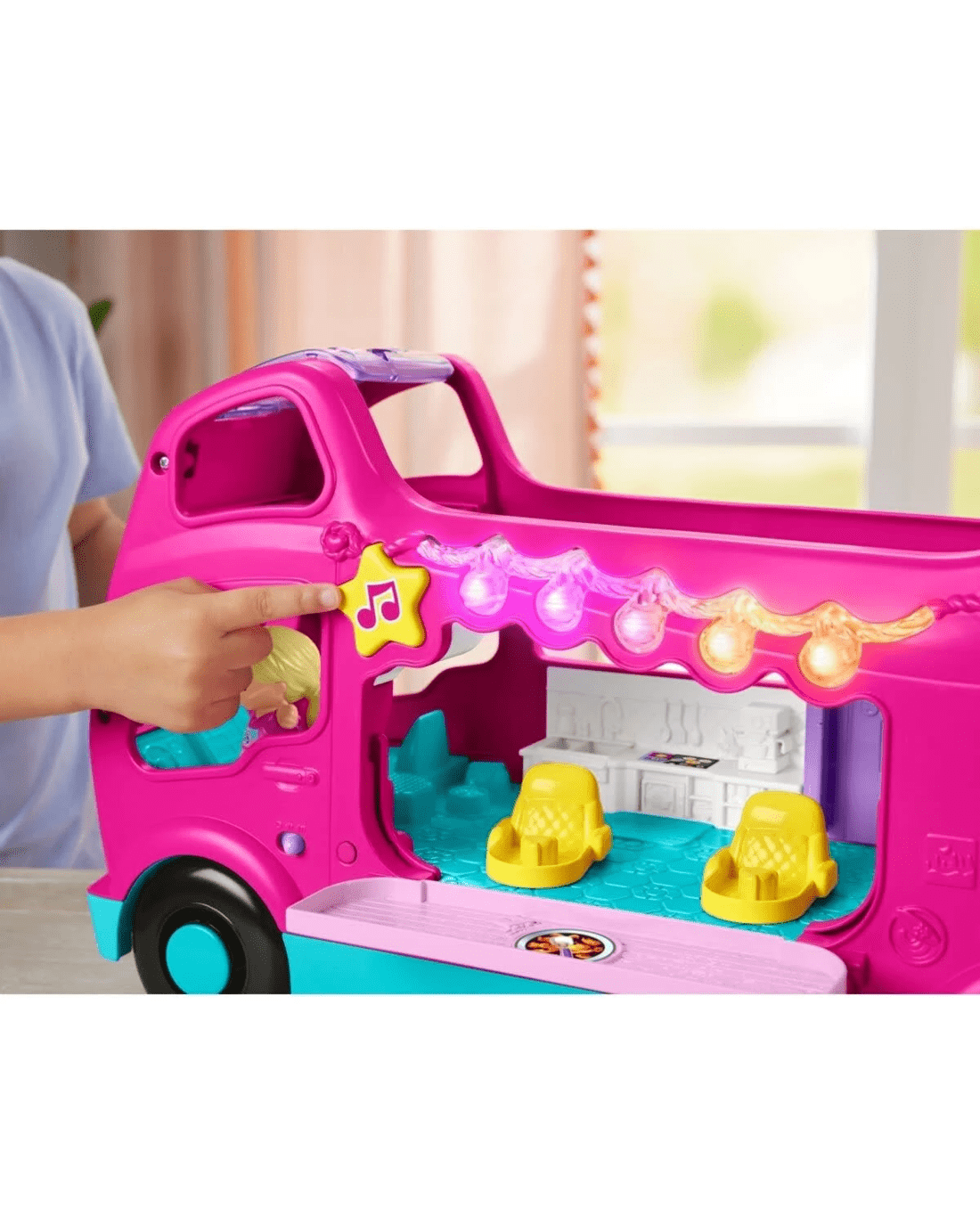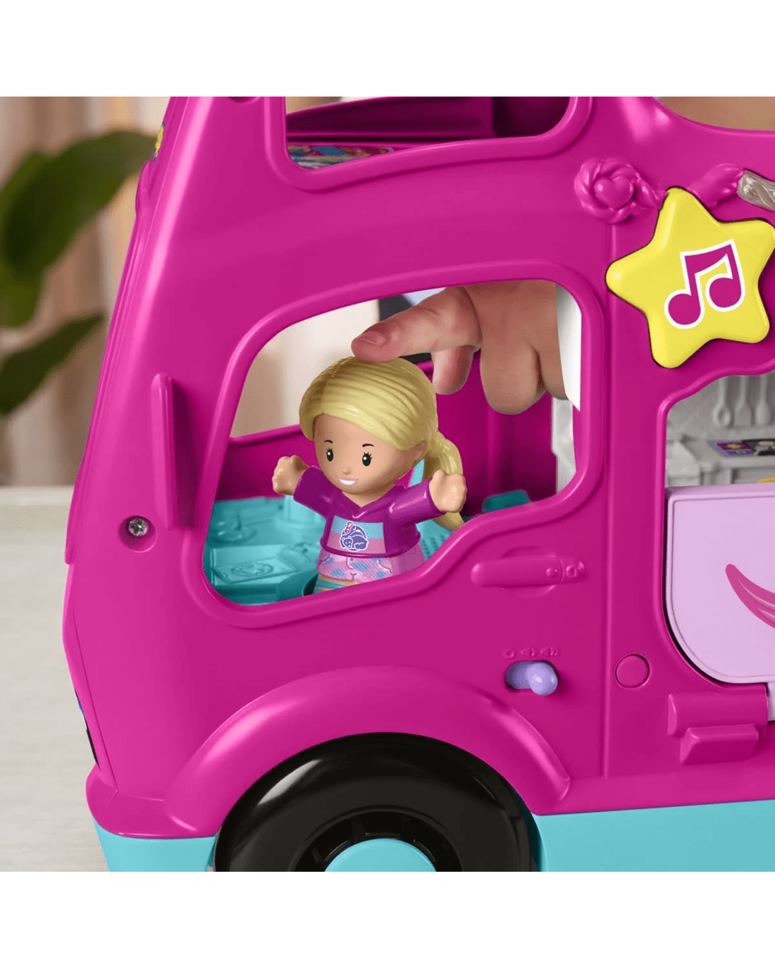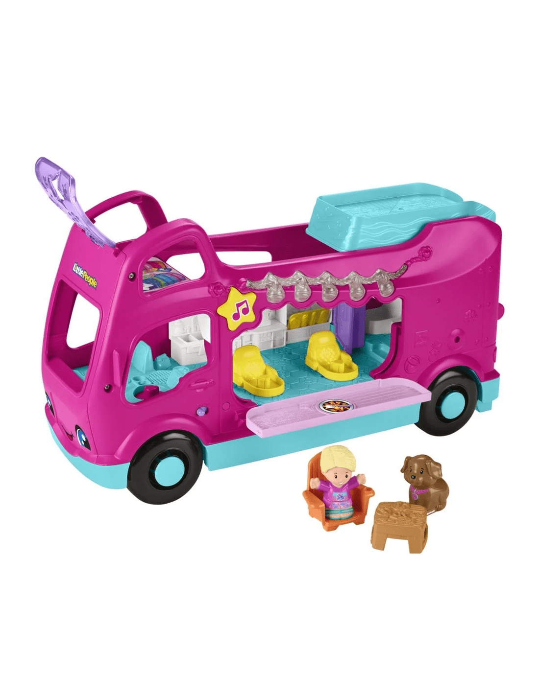 Features- Toddlers can embark on Barbie-themed camping adventures with this musical push-along RV that opens into an interactive Little People playset