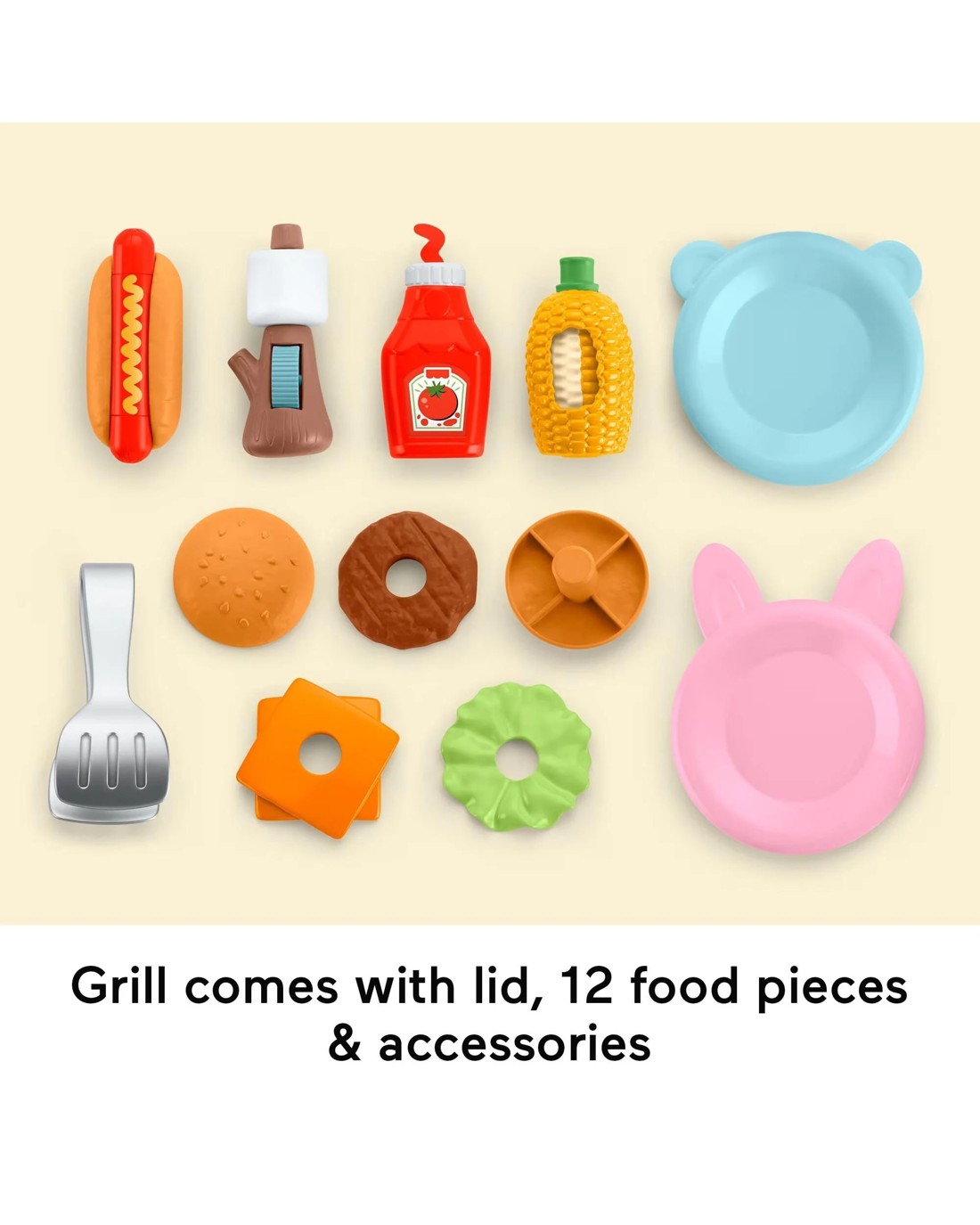 - Remove grill top to store play pieces inside; includes 2 plates, 1 cooking tongs, 5-piece buildable burger, 1 hot dog, 1 corncob, 1 marshmallow skewer, and 1 ketchup/mustard bottle