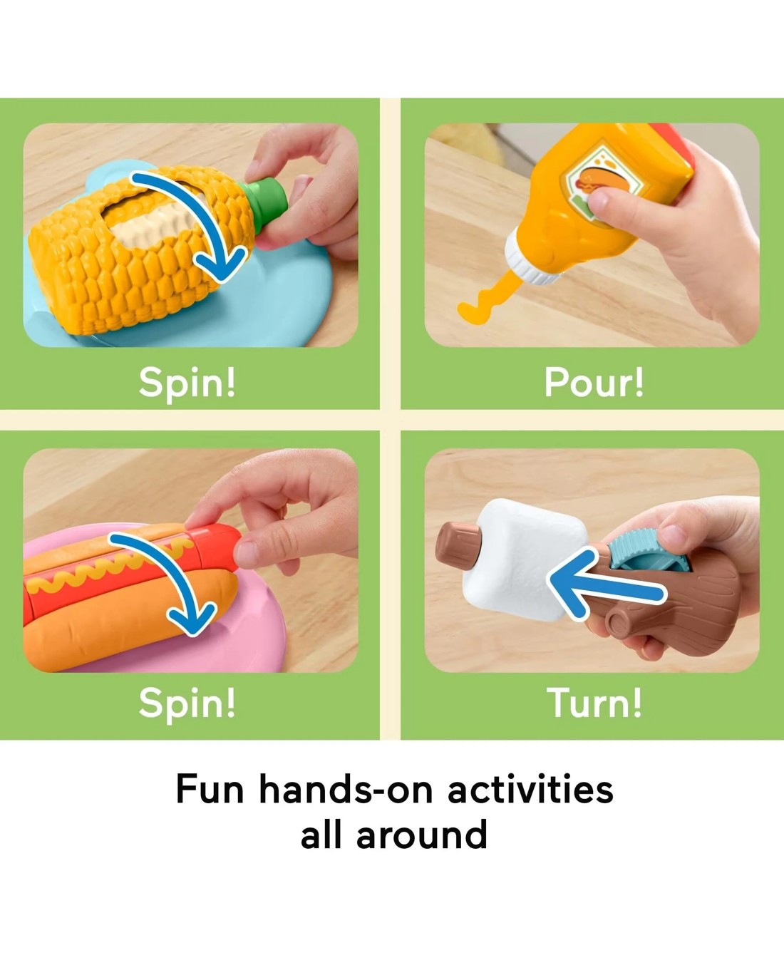 - Fun hands-on activities! Slide grill top “on” and “off,” spin the corncob and hot dog to discover cool surprises, and turn the dial on the marshmallow skewer for “sizzle” sounds