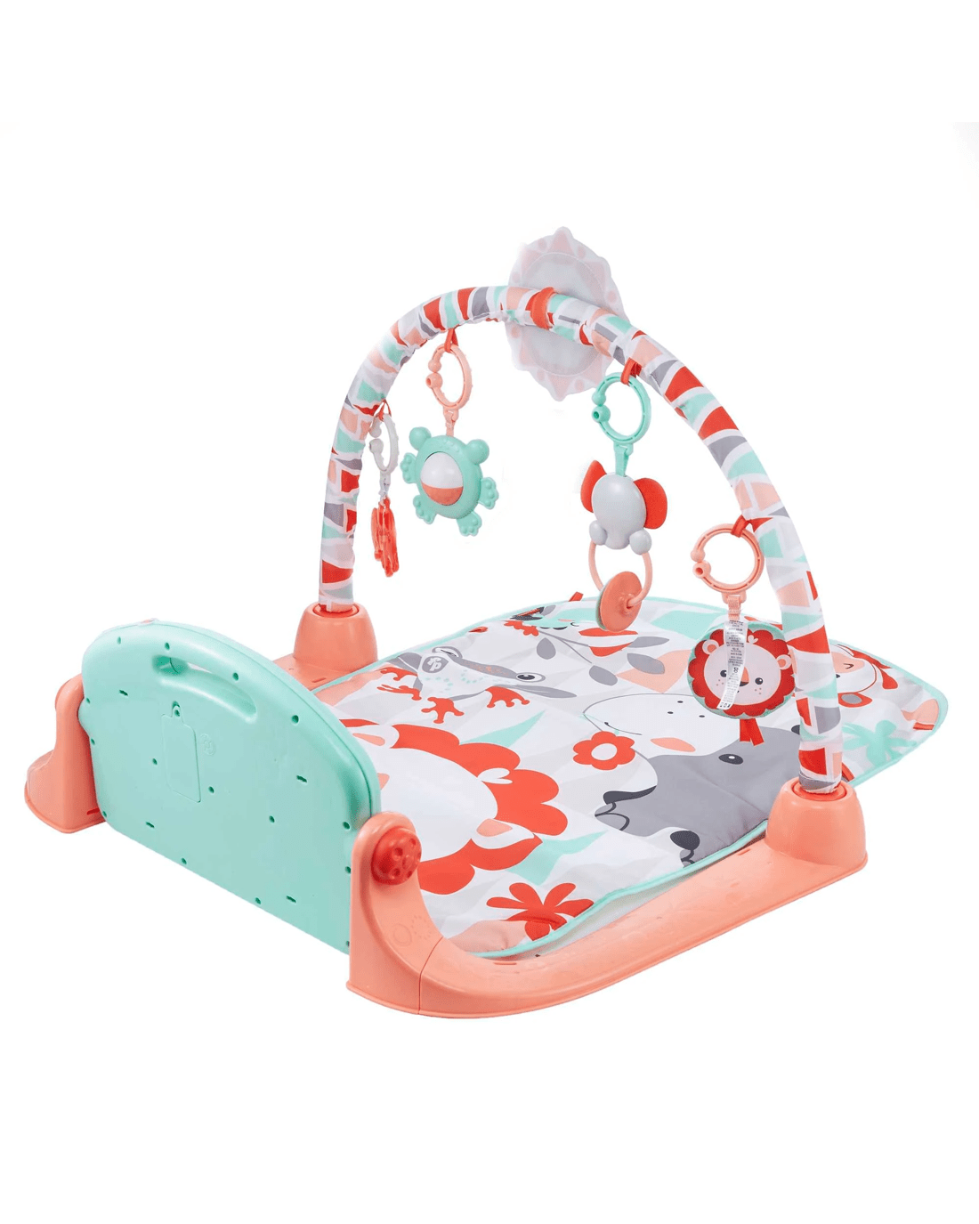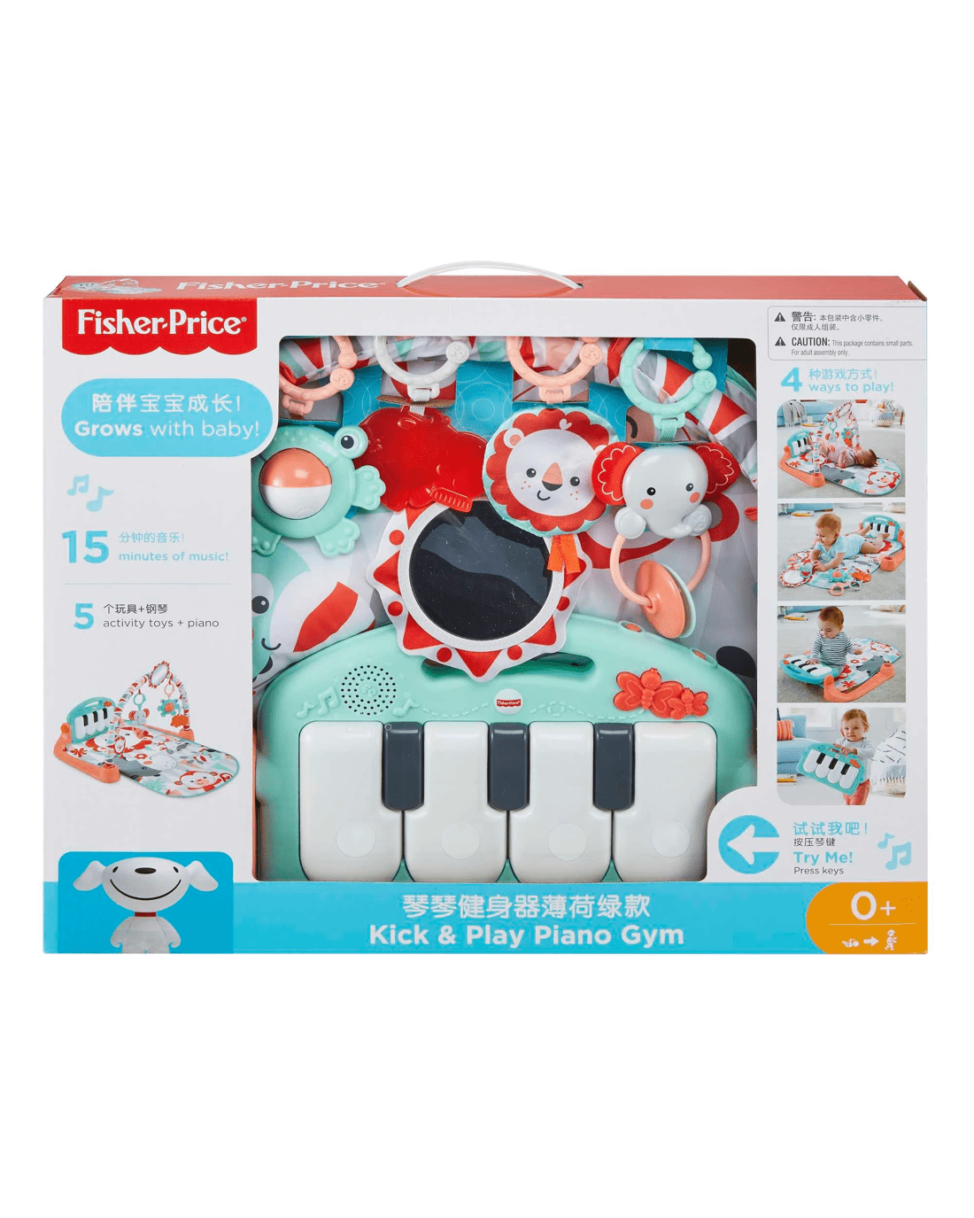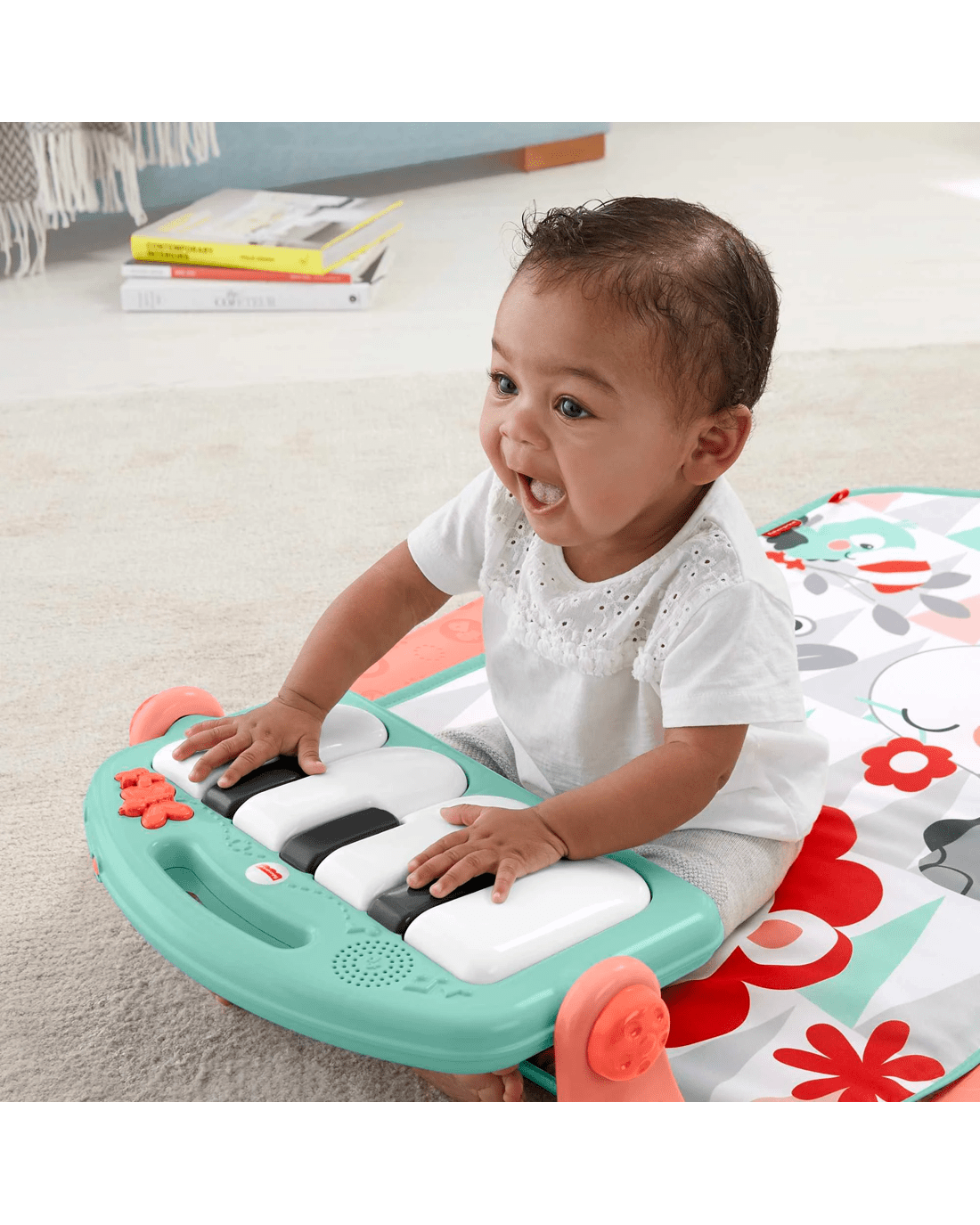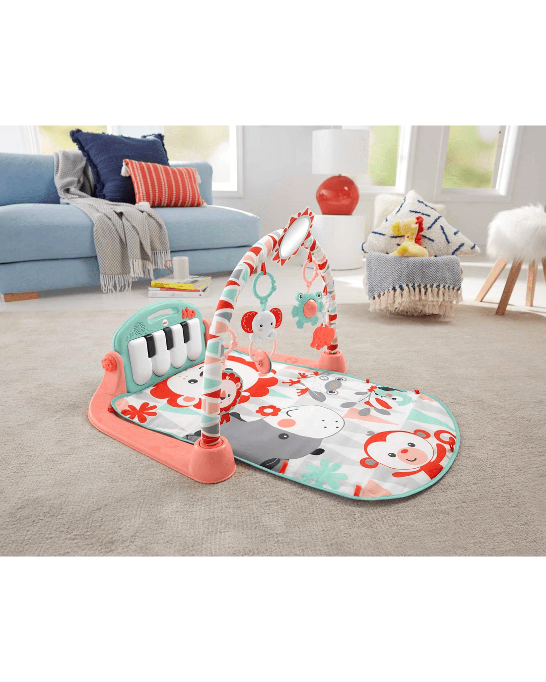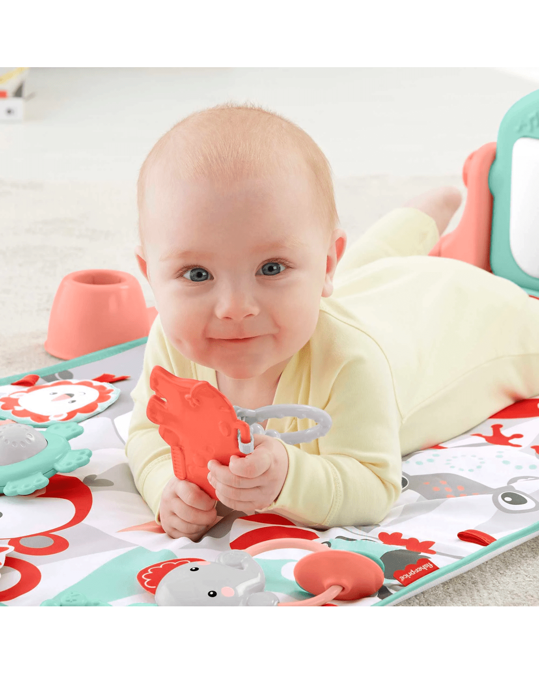 The Fisher-Price Kick & Play Piano Gym rewards your baby's every kick with fun music and sounds. Newborns can reach, bat and grasp five activity toys including a hippo teether, rollerball frog, elephant clacker and crinkle zebra, helping them develop their fine motor skills. As your baby grows, move the arch down for tummy time play so they can push up and engage those neck and core muscles while gazing at their sweet reflection in the mirror! And when they're ready for their own concert, let your little Mozart sit up and entertain you with the piano! Musical playtime doesn't have to end on the mat - you can take the removable piano wherever you and your baby go for portable play!