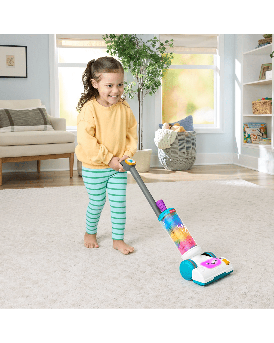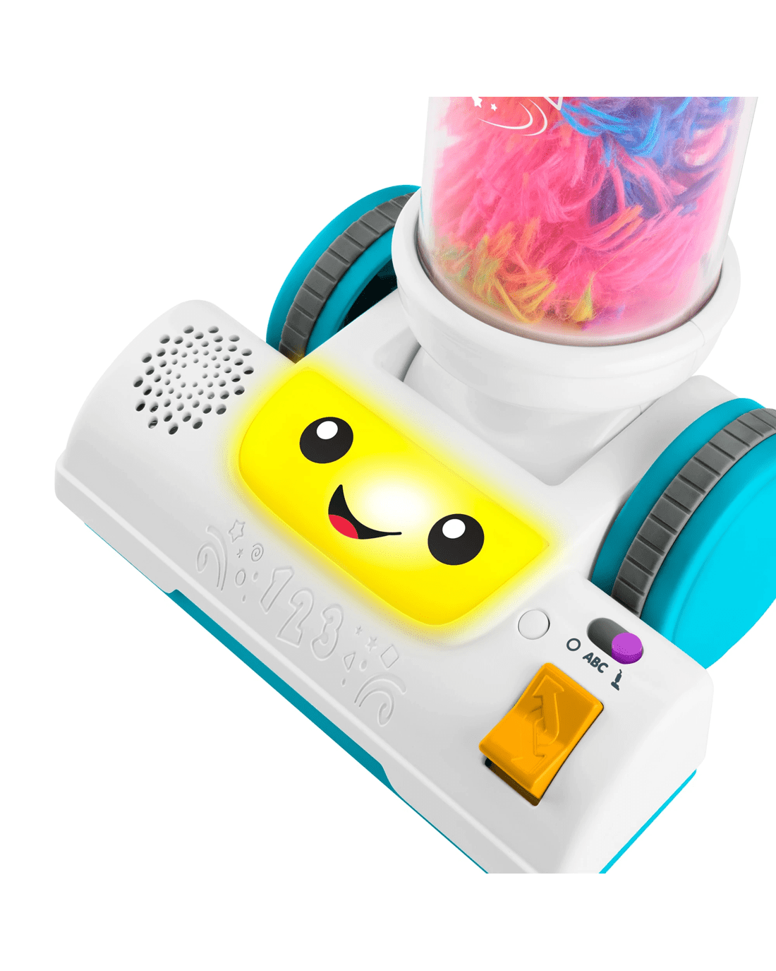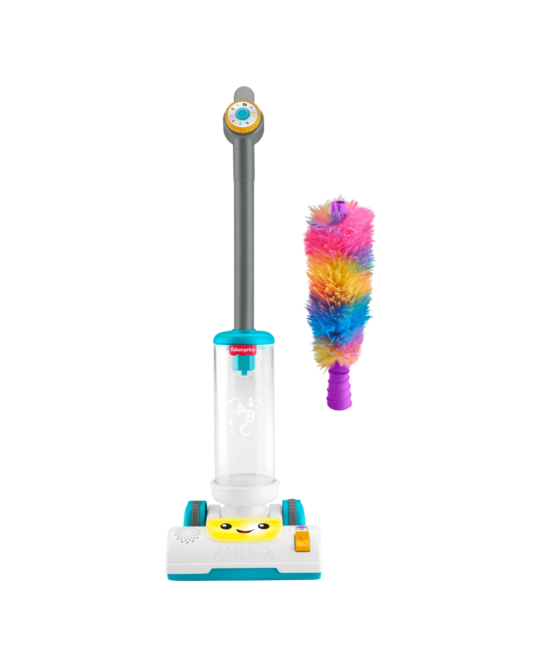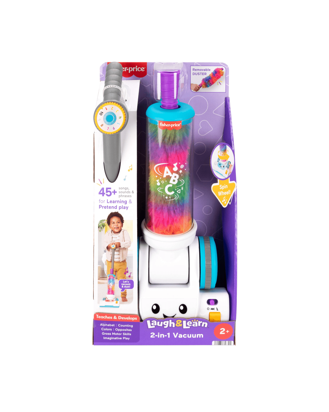The Laugh & Learn 2-in-1 Vacuum electronic toy from Fisher-Price offers 2-in-1 learning fun for toddlers with classic push-along pretend play and a removable fuzzy duster! Sized just right for toddlers to roll and explore, this toy vacuum features cool twirling action, multicolour lights and two play modes with 45+ songs, sounds and phrases. Kids can pretend to tidy up while discovering the alphabet, counting, colours and more!