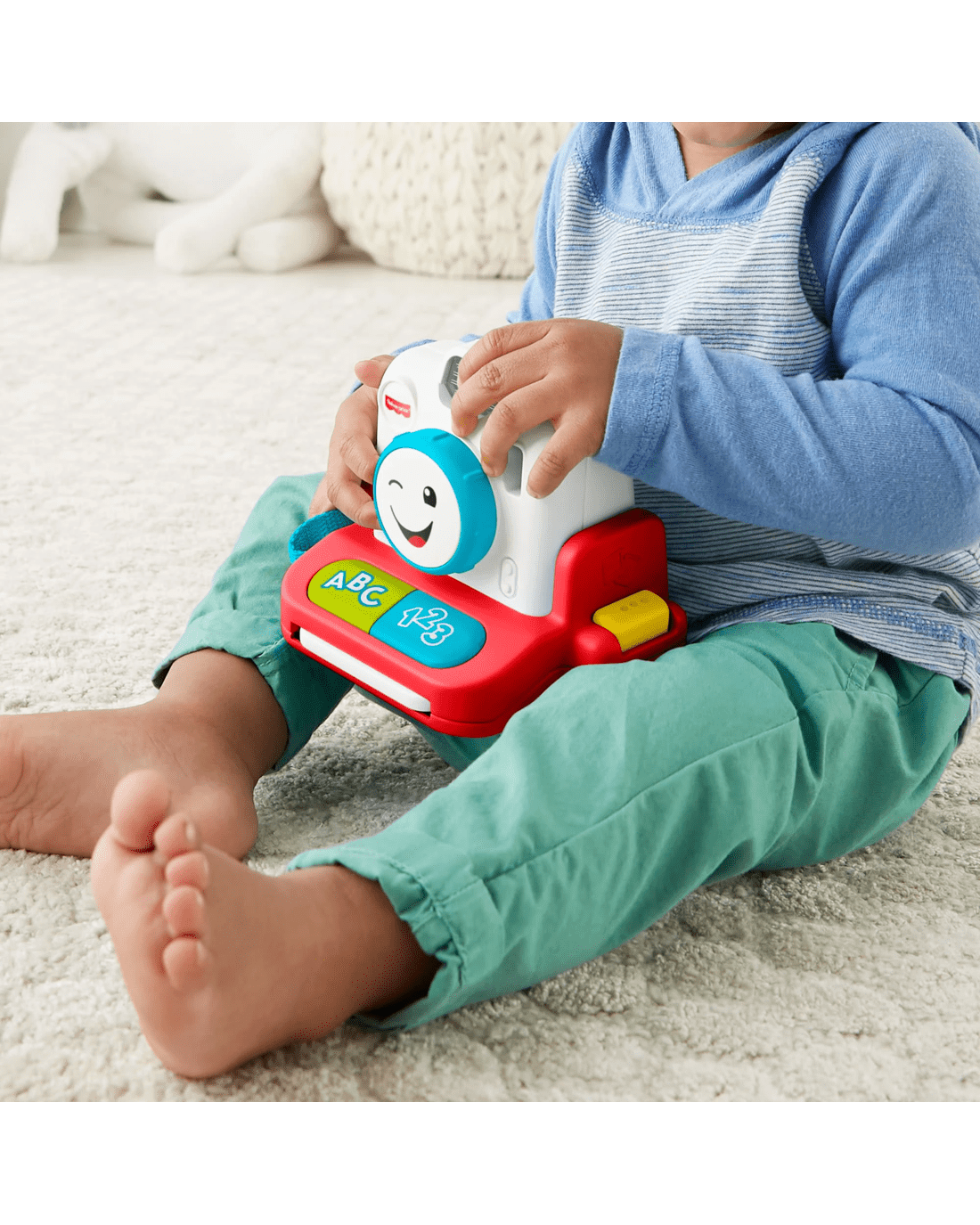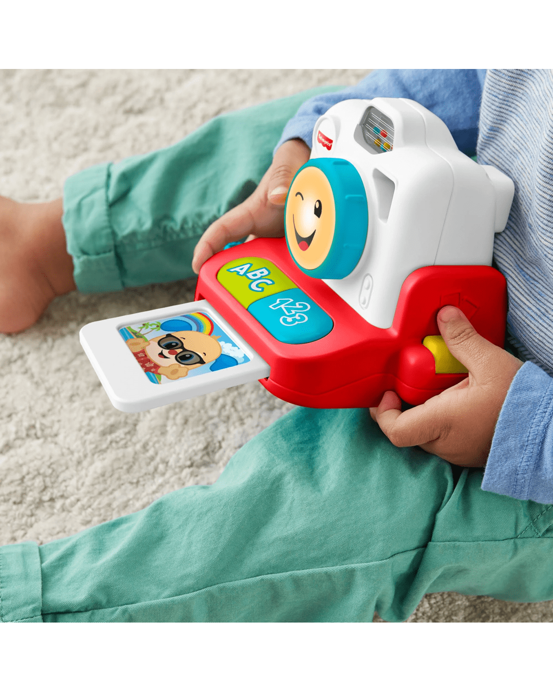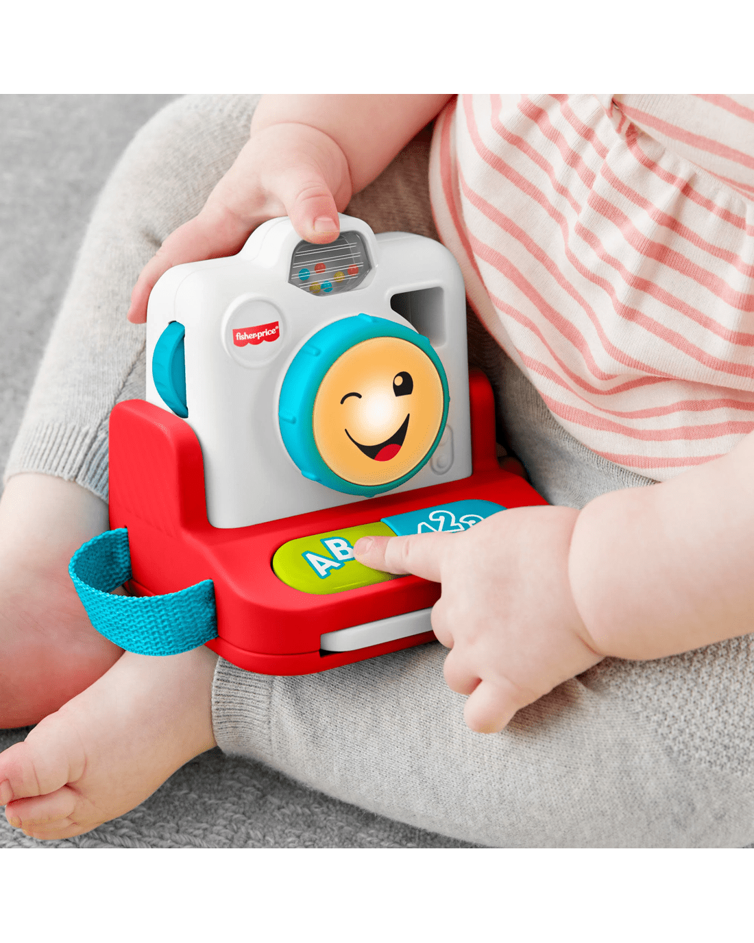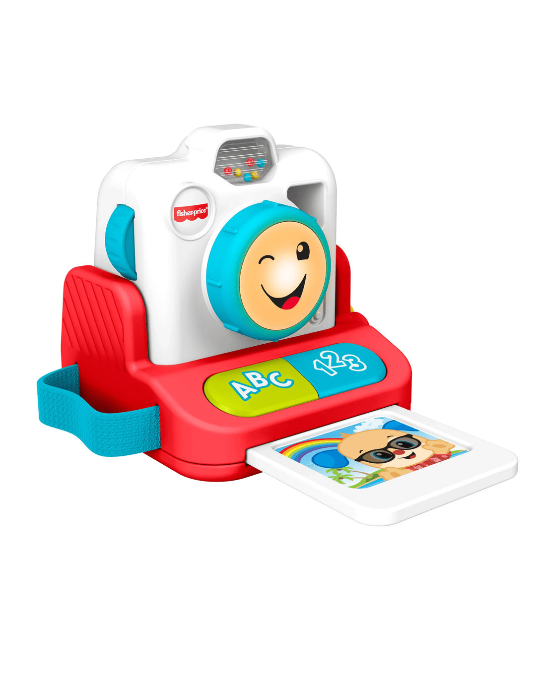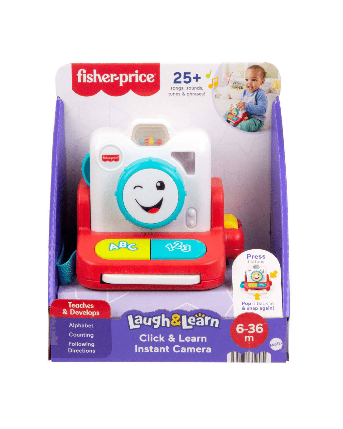 Baby is in for hours of instantly fun pretend play with this musical learning toy camera from Fisher-Price! With the Laugh & Learn Click & Learn Instant Camera toy, mini-photographers can 'snap' photos while songs and phrases introduce the alphabet, counting and following directions. Inspired by the grownup version, this pretend camera features a light 'flash,' realistic sounds and fun hands-on activities for your baby to explore. Say cheese, Puppy!