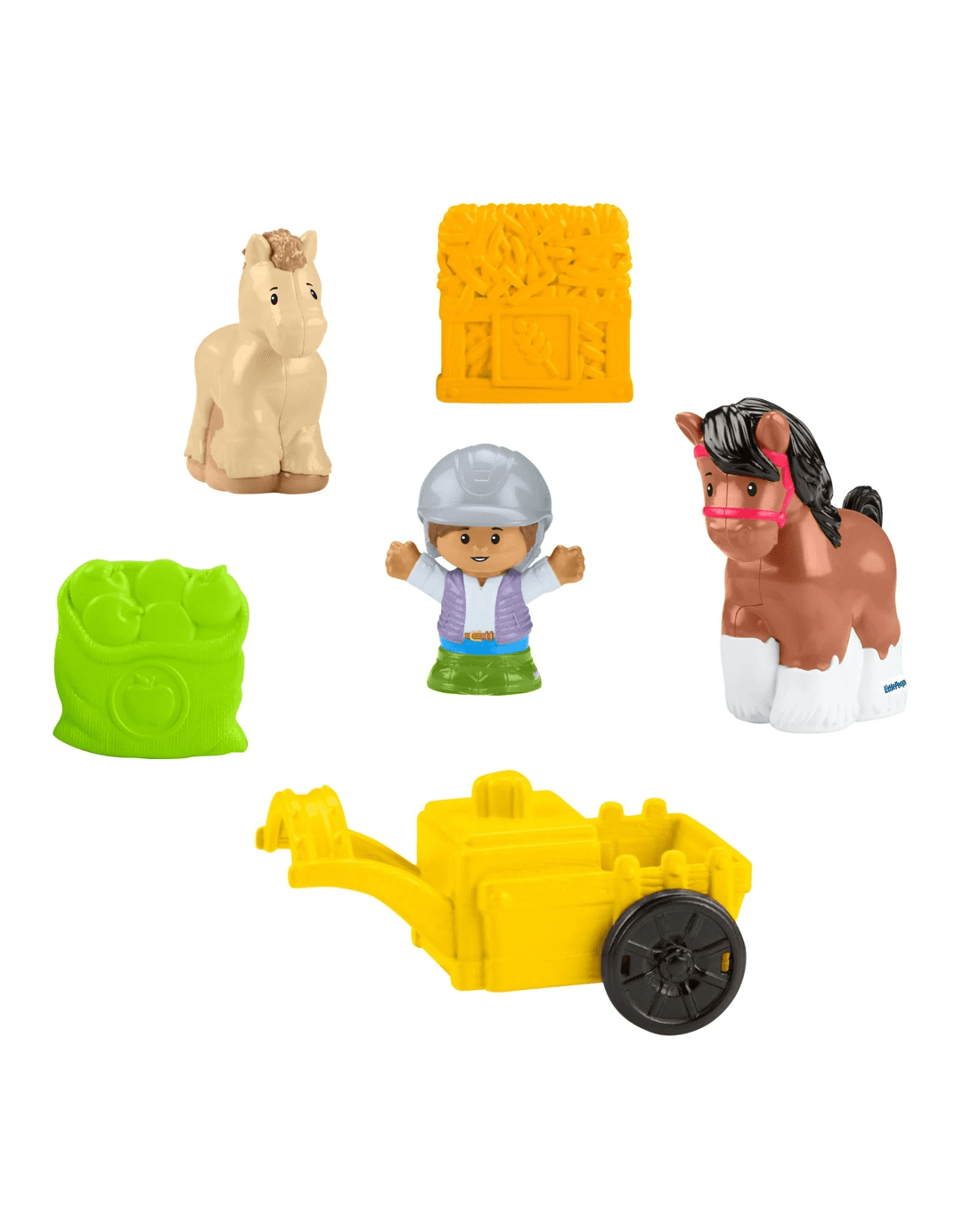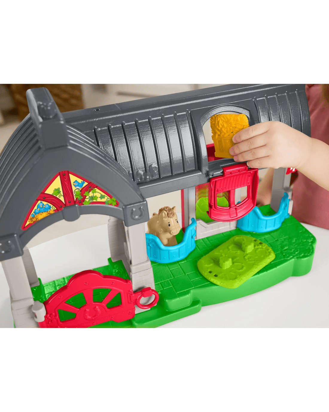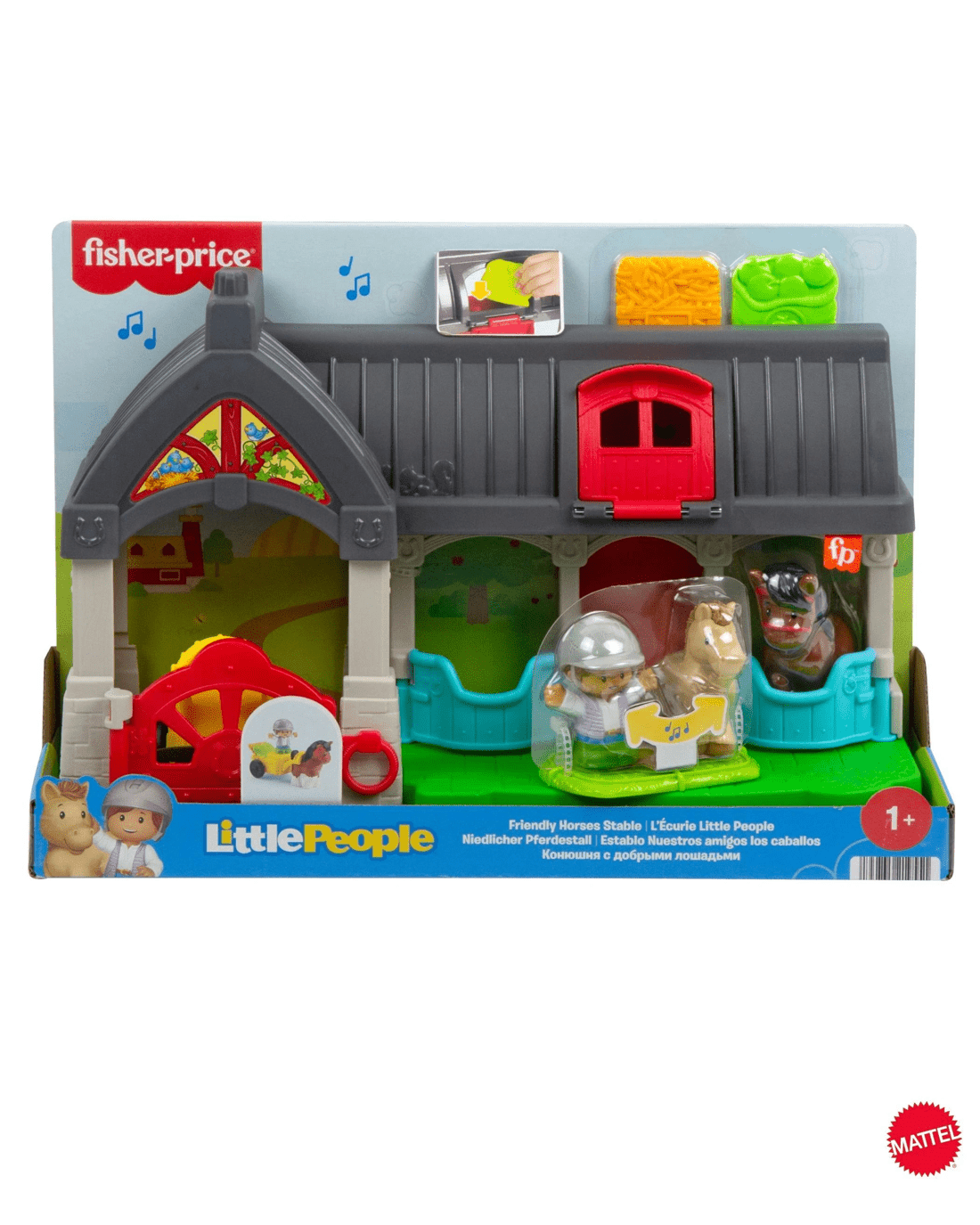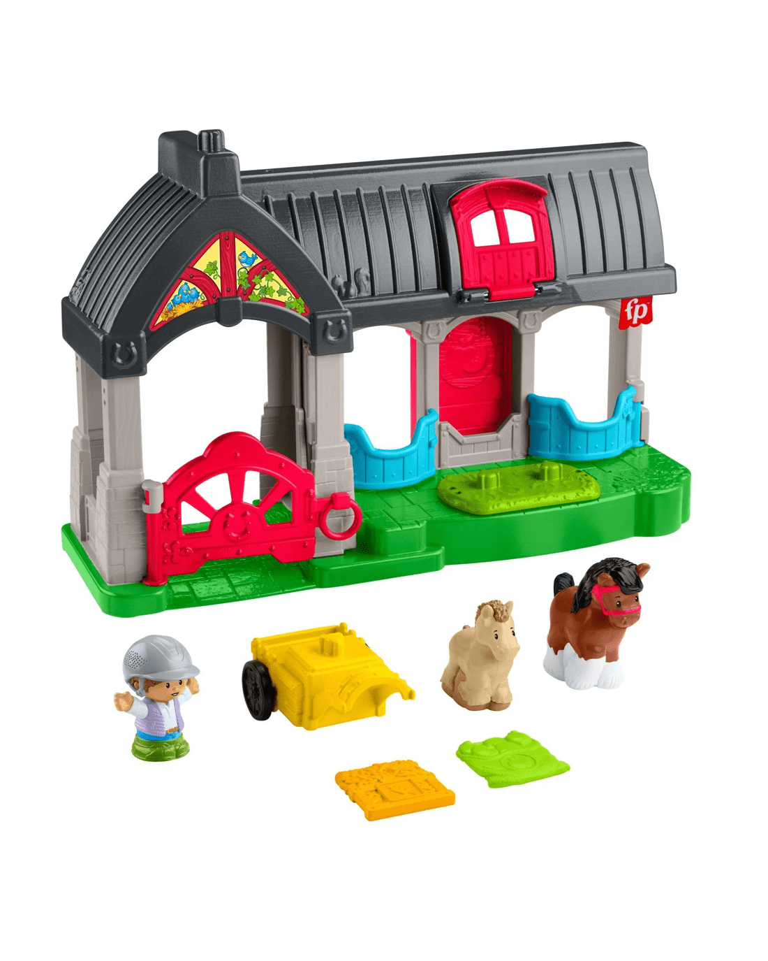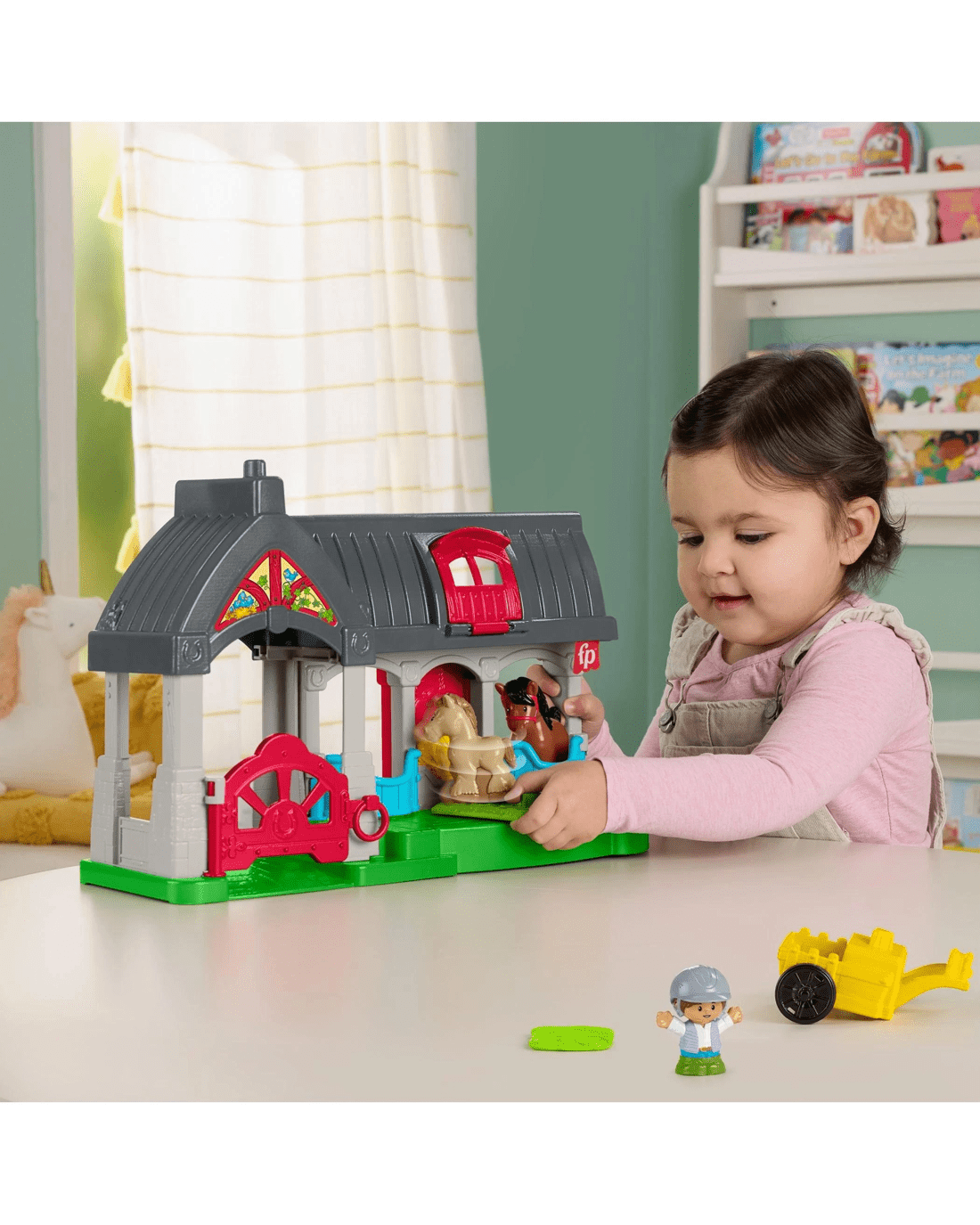 • Toddler-friendly horse stable playset with barn, 2 toy horses, 1 caretaker figure, an attachable wagon, and 2 food play pieces