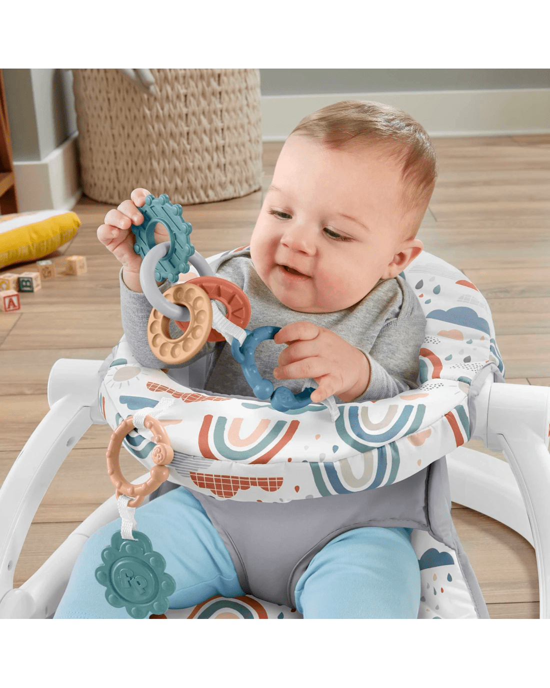 • Comes with a clacker and flower teether toy for playtime