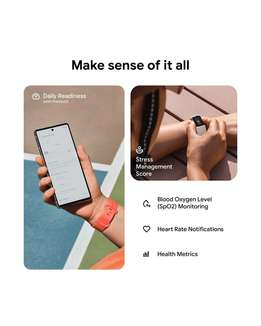 - Track your heartrate, activity time, distance covered, energy expended and sleep quality.