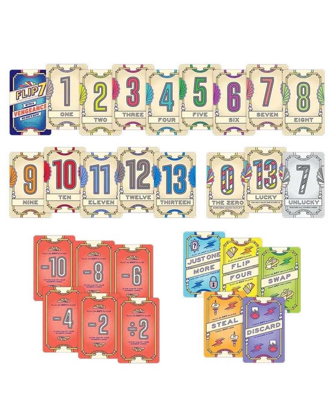 The hard-boiled sequel to the award-winning, instant classic, Flip 7. Flip over cards one by one without flipping the same number twice. Flip over cards one by one without flipping the same number twice. Sound easy? Think again! This isn't just any deck of cards… In Flip 7: With A Vengeance, there's only one 1 card, two 2's, three 3's, etc. plus a bunch of special cards that can score you extra points, steal any card, or force an opponent to draw one more card! Are you the type of player to play it safe and bank points before you bust, or are you going to risk it all and go for the bonus points by flipping over seven in a row? Press your luck meets strategy in this addictive card game where no one is ever really safe. Ages: 8 + | Players: 3 + | Playtime: 20 Mins