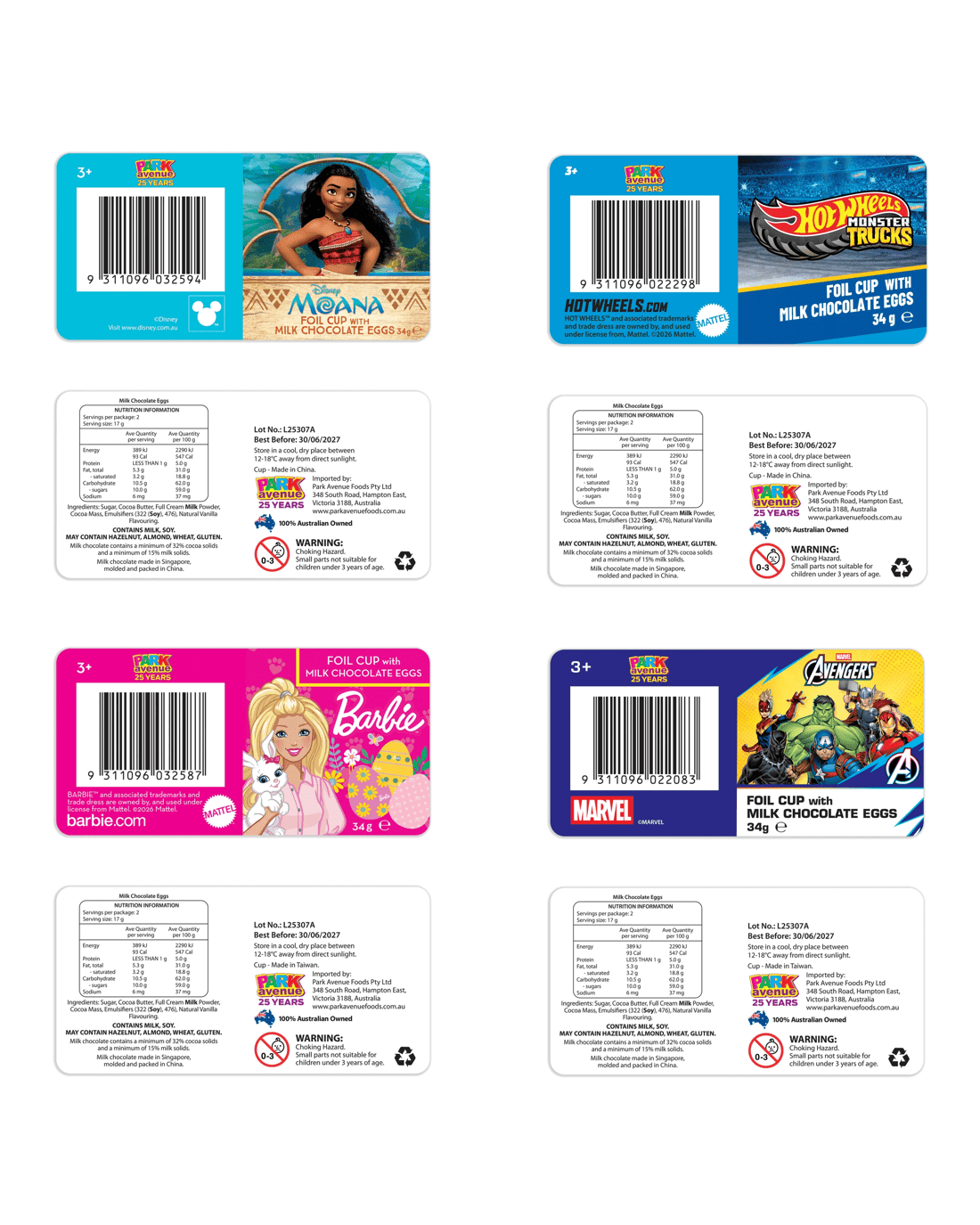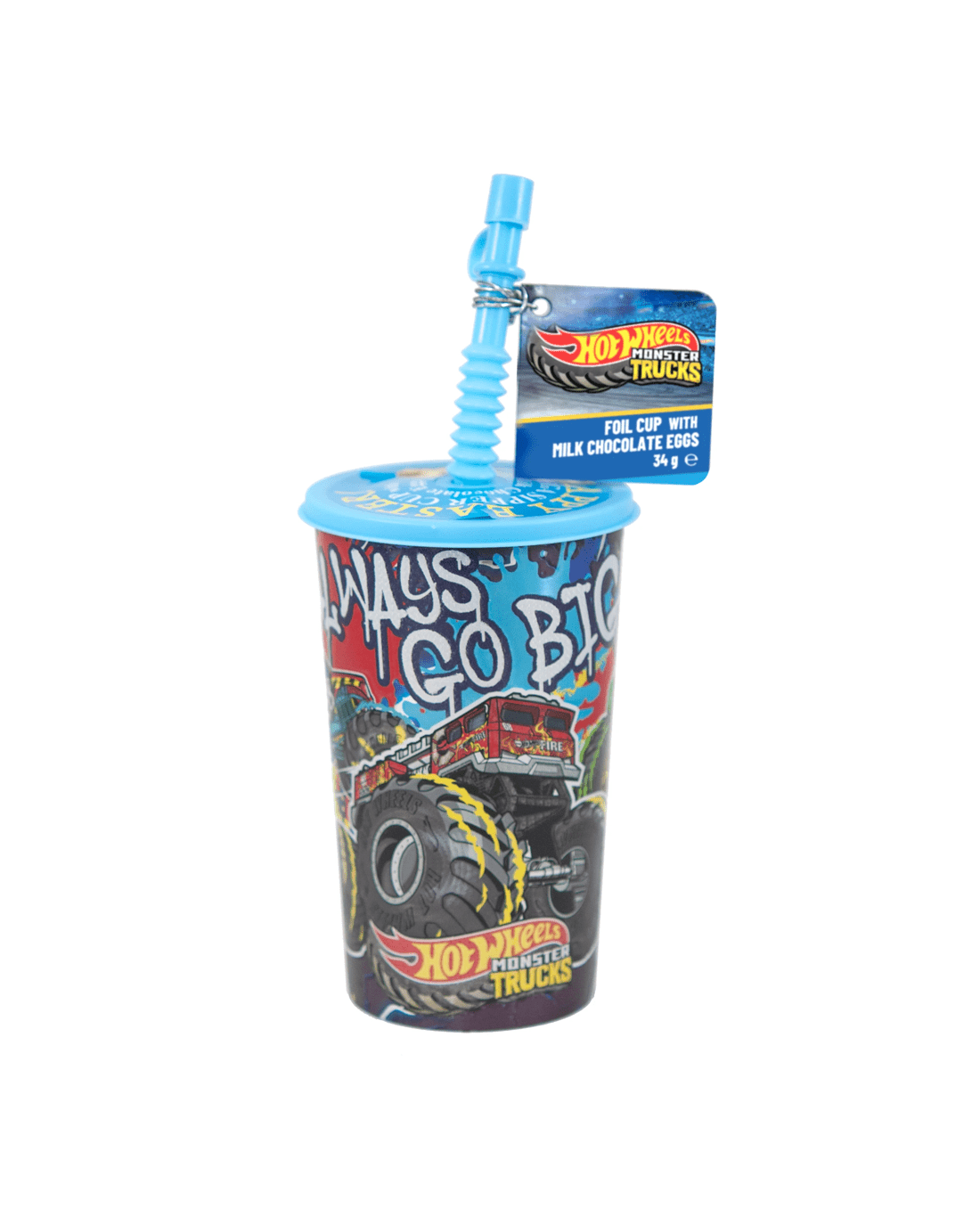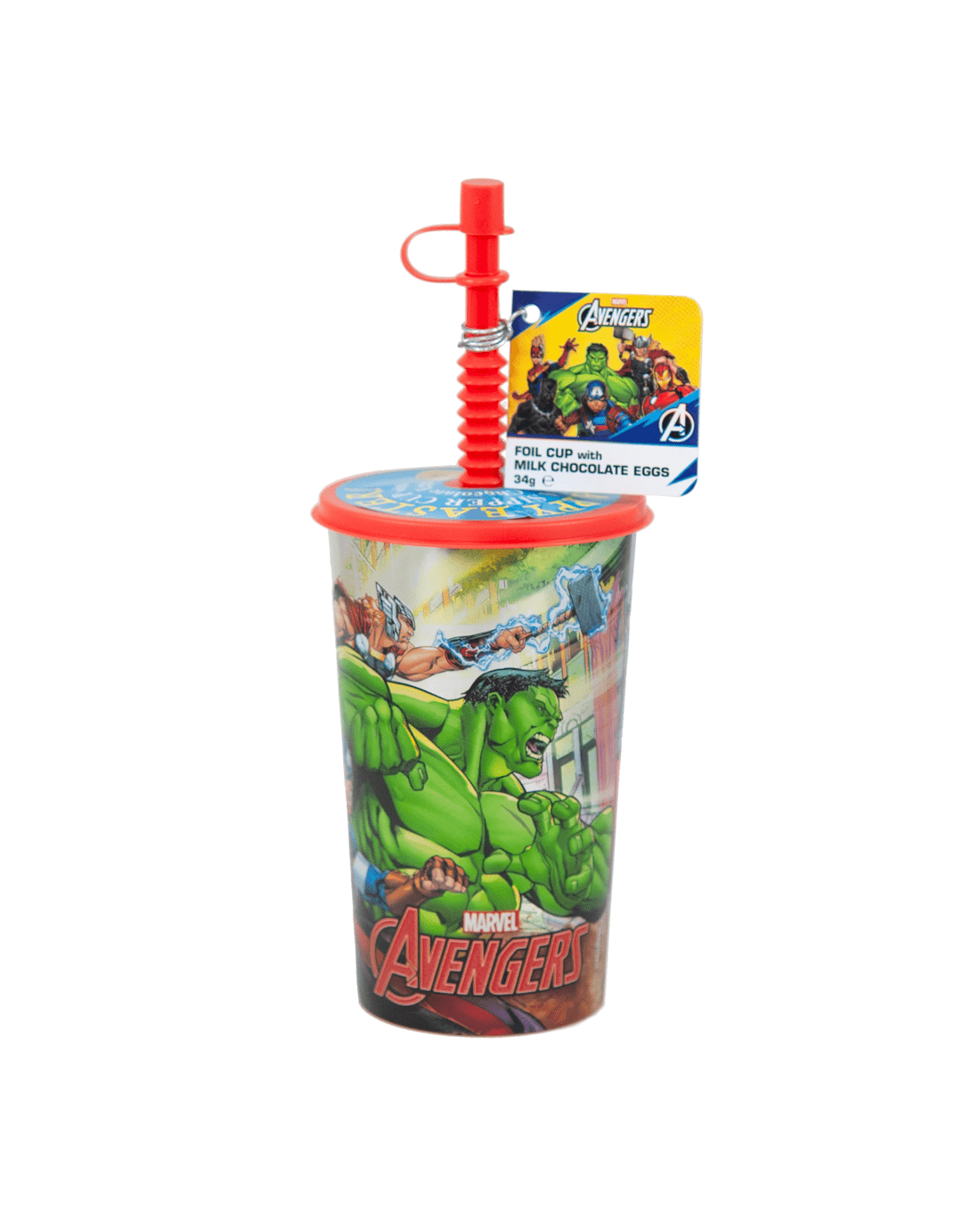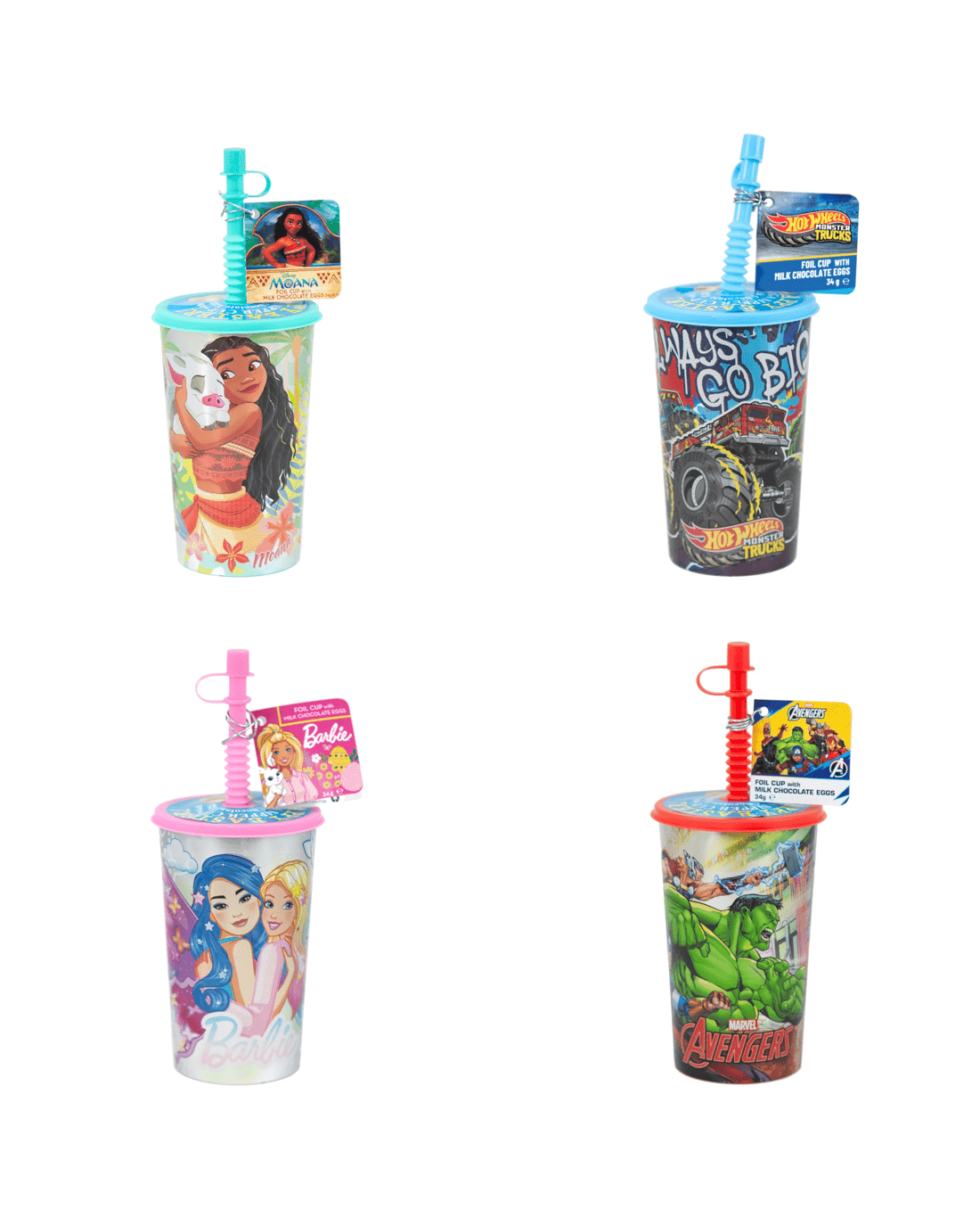 *Each sold separatelyStand out from the crowd with our super vibrant foil cups. It is decorated in your favourite Avengers, Barbie, Hot Wheels and Moana characters and filled with delicious milk chocolate eggs!