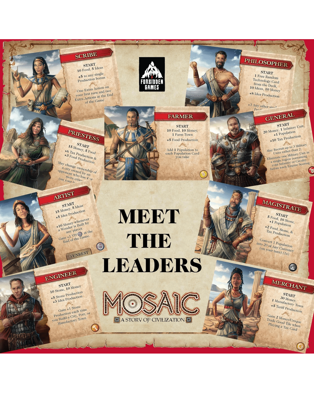 In Mosaic, you guide an ancient civilization from its founding. Your decisions will determine whether it will thrive and be remembered as the greatest civilization in history, or falter and be lost to the sands of time.Which Leader will guide you? Which technologies and advantages will your civilization research? Where will you found your starting city? Will you focus on expansion or productivity? Will you build soaring wonders or trade networks? Will you found new cities and towns, or recruit powerful armies to create an empire? Will your people praise you during a golden age, or curse you for your oppressive taxes? Each decision that you make is another shining stone in your civilization's unique mosaic. Ages: 14 + | Players: 2 - 6