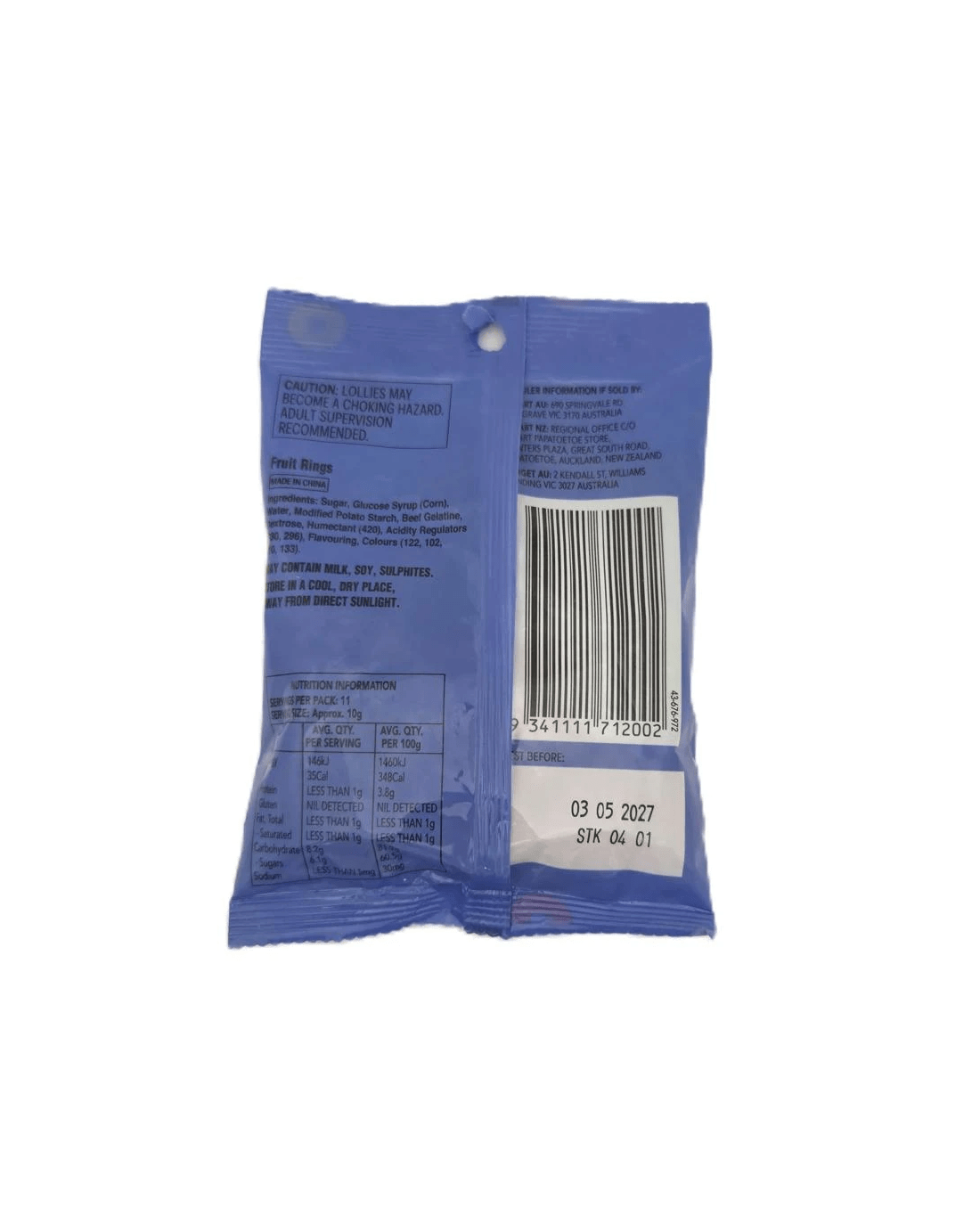 • Ingredients: Sugar, Glucose Syrup (Corn), Water, Modified Potato Starch, Beef Gelatine, Dextrose, Humectant (420), Acidity Regulators (330, 296), Flavouring, Colours (122, 102, 110, 133)