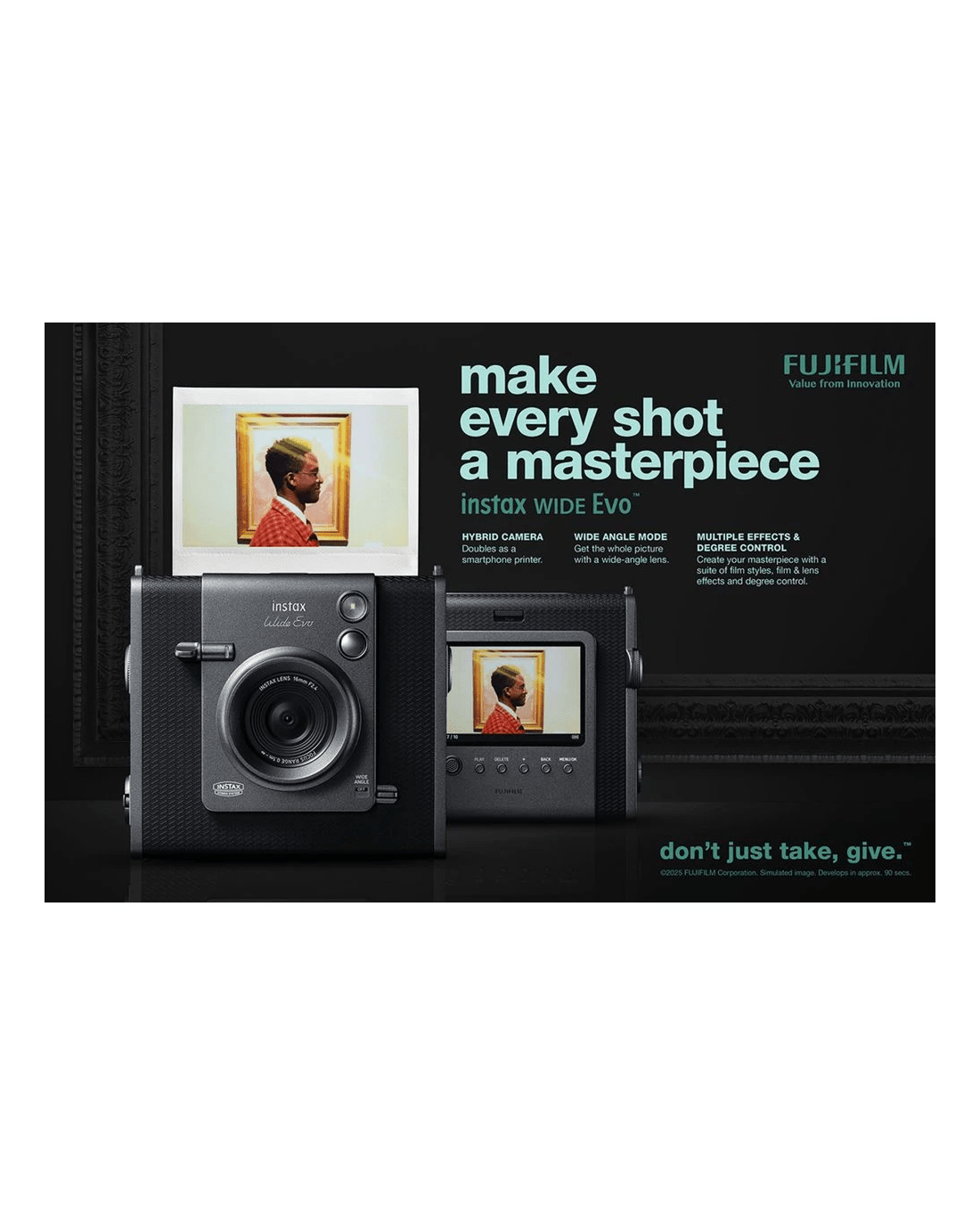 There's no end to your imagination when using the Instax Wide Evo, an instant camera that provides 10 lens and film effects so you can customise all of your shots. You can change the degree of these effects to your liking with the handy control dial, allowing you to explore the cinematic film style of the photos you take in both dramatic and subtle manners. It's equipped with a wide-angle lens, so you can capture a truly large field of memories.