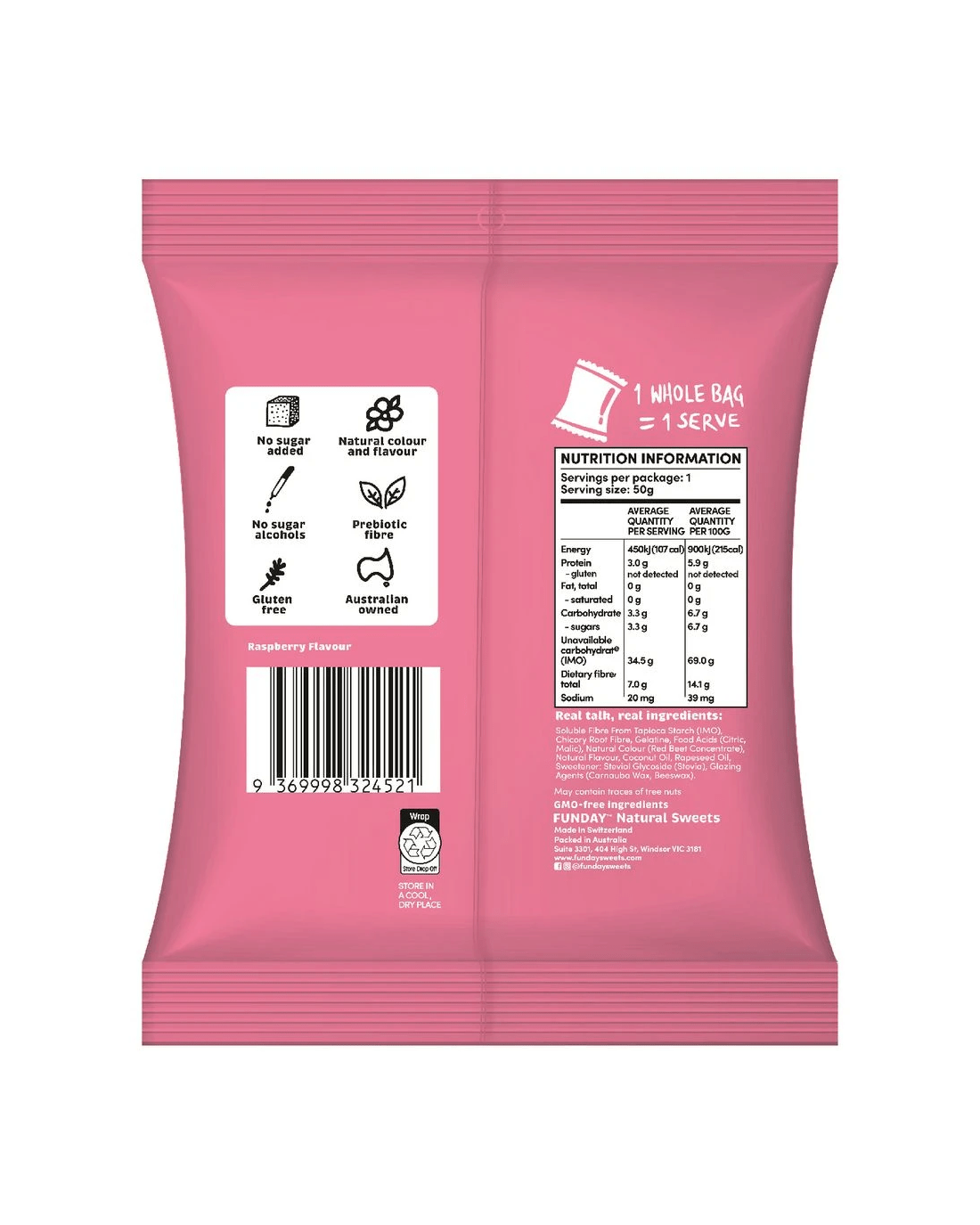 • Ingredients: Soluble Fibre From Tapioca Starch (IMO), Chicory Root Fibre, Gelatine, Food Acids (Citric, Malic), Natural Colour (Red Beet Concentrate), Natural Flavour, Coconut Oil, Rapeseed Oil, Sweetener - Steviol Glycoside (Stevia), Glazing Agents (Carnauba Wax, Beeswax).