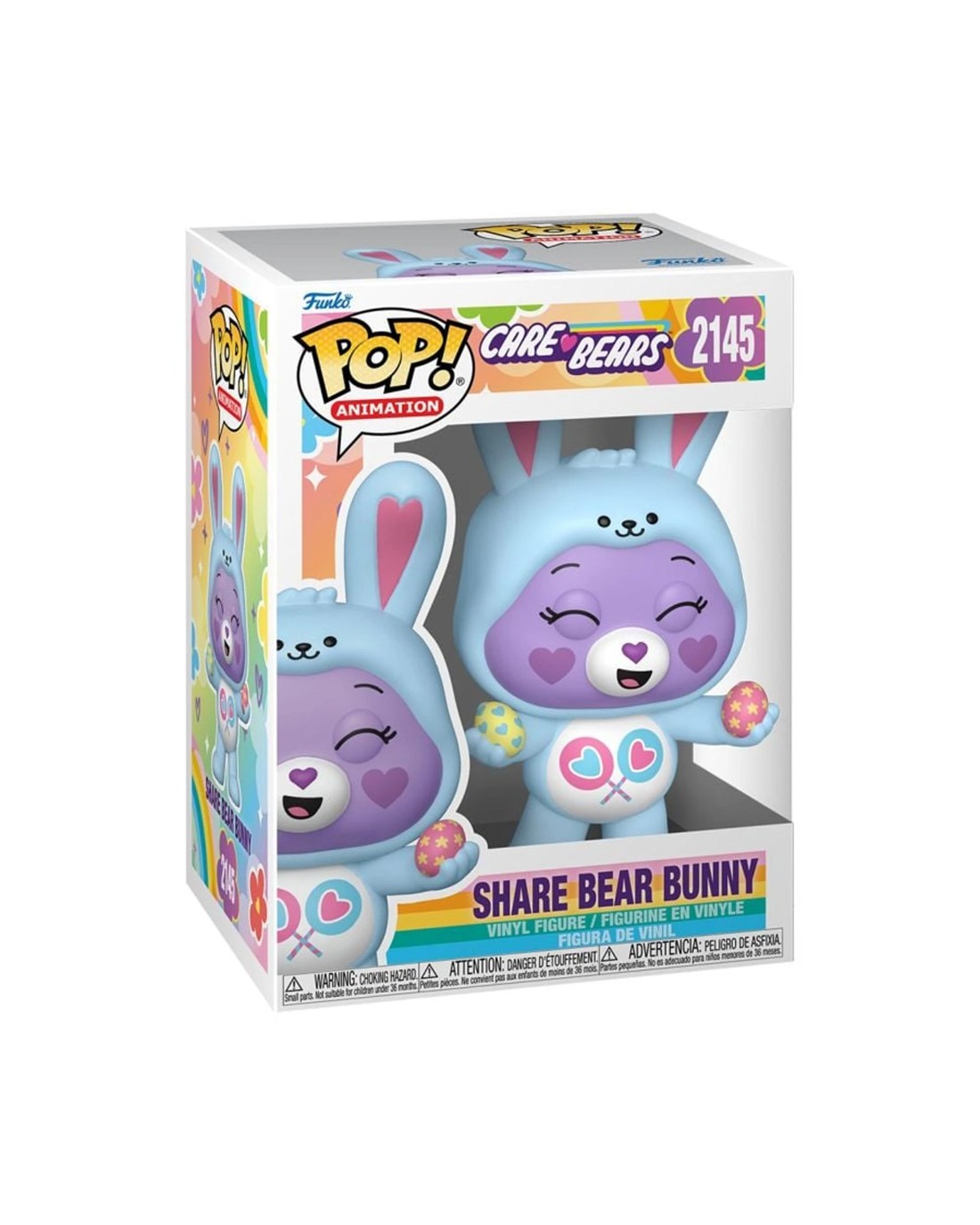 Hop into your favourite springtime celebrations with POP! Share Bear Bunny! Expand your circle of friends when you reunite her with the rest of the Care Bears in your POP! Animation collection. No Care Bears lineup would be complete without POP! Share Bear Bunny to join the fun! Vinyl figure is approximately 5.2 in (13.2 cm) tall. Ages 3 +