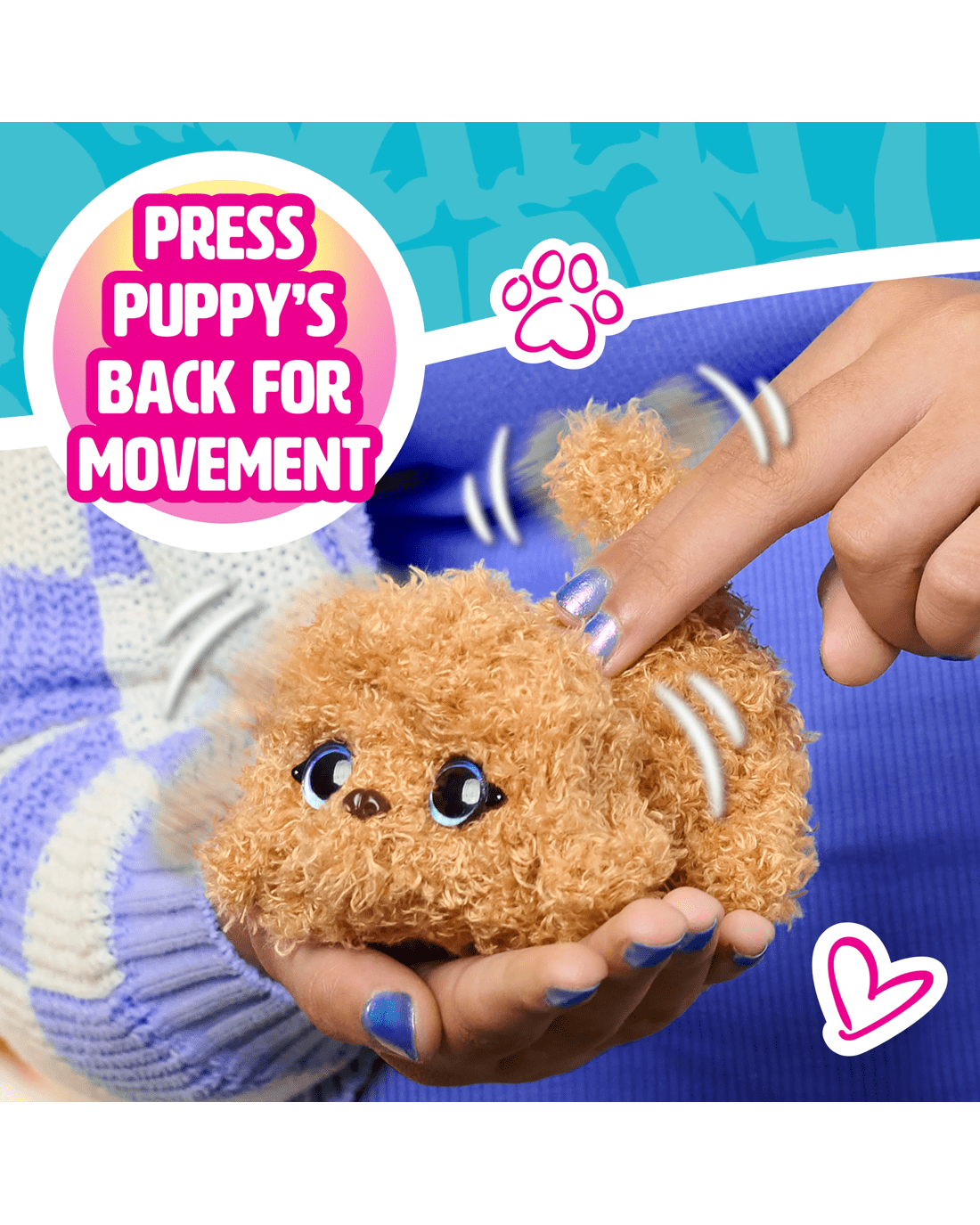 - Wags for Days: Pet the back of the My Minis plush toy to activate tail wags and head bobs.