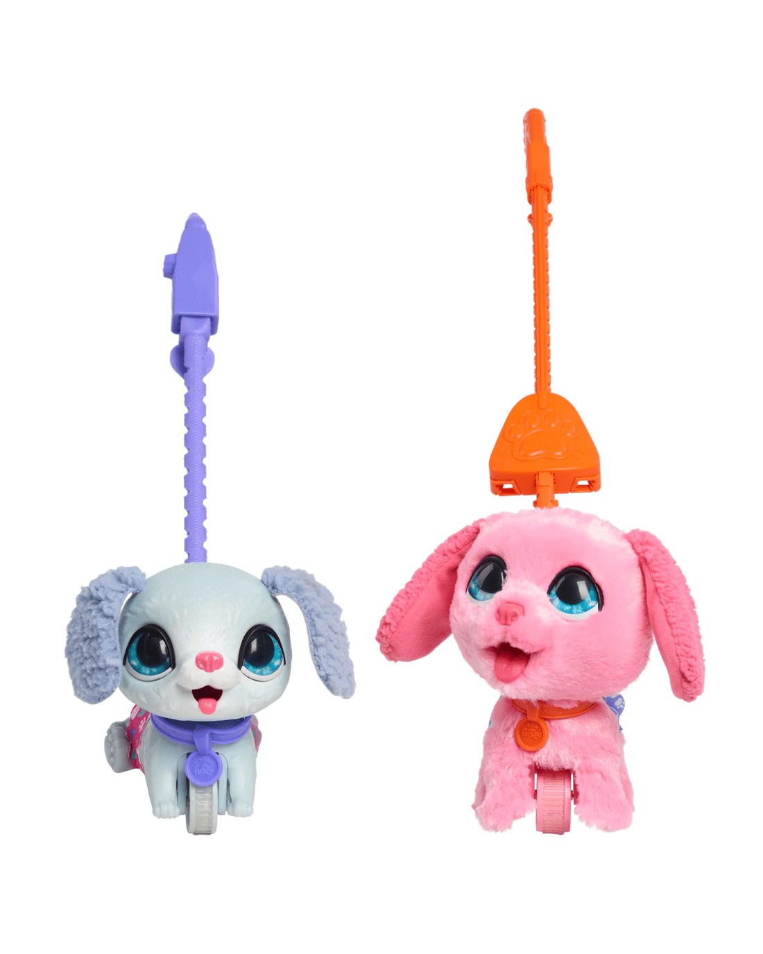 - Includes 2 x interactive toy dogs, 2-piece detachable leash, play treats, bottle and poop scoop