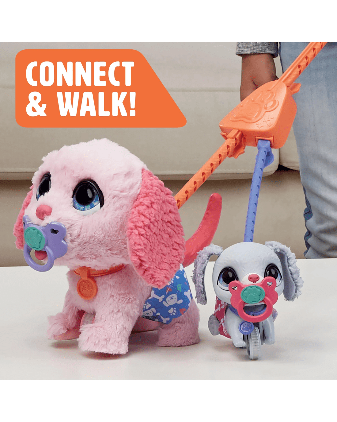 - Learn to care for pets: After feeding the pink pup the play treats, connect her leash and gently push down a hallway or sidewalk to see her 'poop.' After feeding the purple and white pup from her bottle, gently pull up on her tail to see her 'pee.'