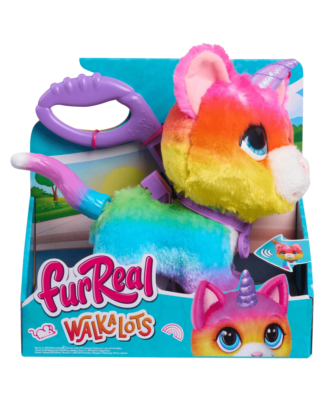 Bring a touch of magic into playtime with the Furreal Walk-A-Lots Big Wags Unicorn Cat Toy. This enchanting companion features a dazzling ombre rainbow coat, a charming unicorn horn, and sparkling blue eyes that are sure to win your heart. Easy to attach to its leash, children can guide their fantastical unicorn cat for lively walks around the house, watching her head bob and listening to her delightful sounds as she goes. After adventuring, she is always ready to offer cuddles and companionship, making every play session memorable. Perfect for encouraging imaginative play, this friendly feline is an ideal gift for any young animal lover. Give your child the joy of their very own magical pet—bring home the Furreal Walk-A-Lots Unicorn Cat today.