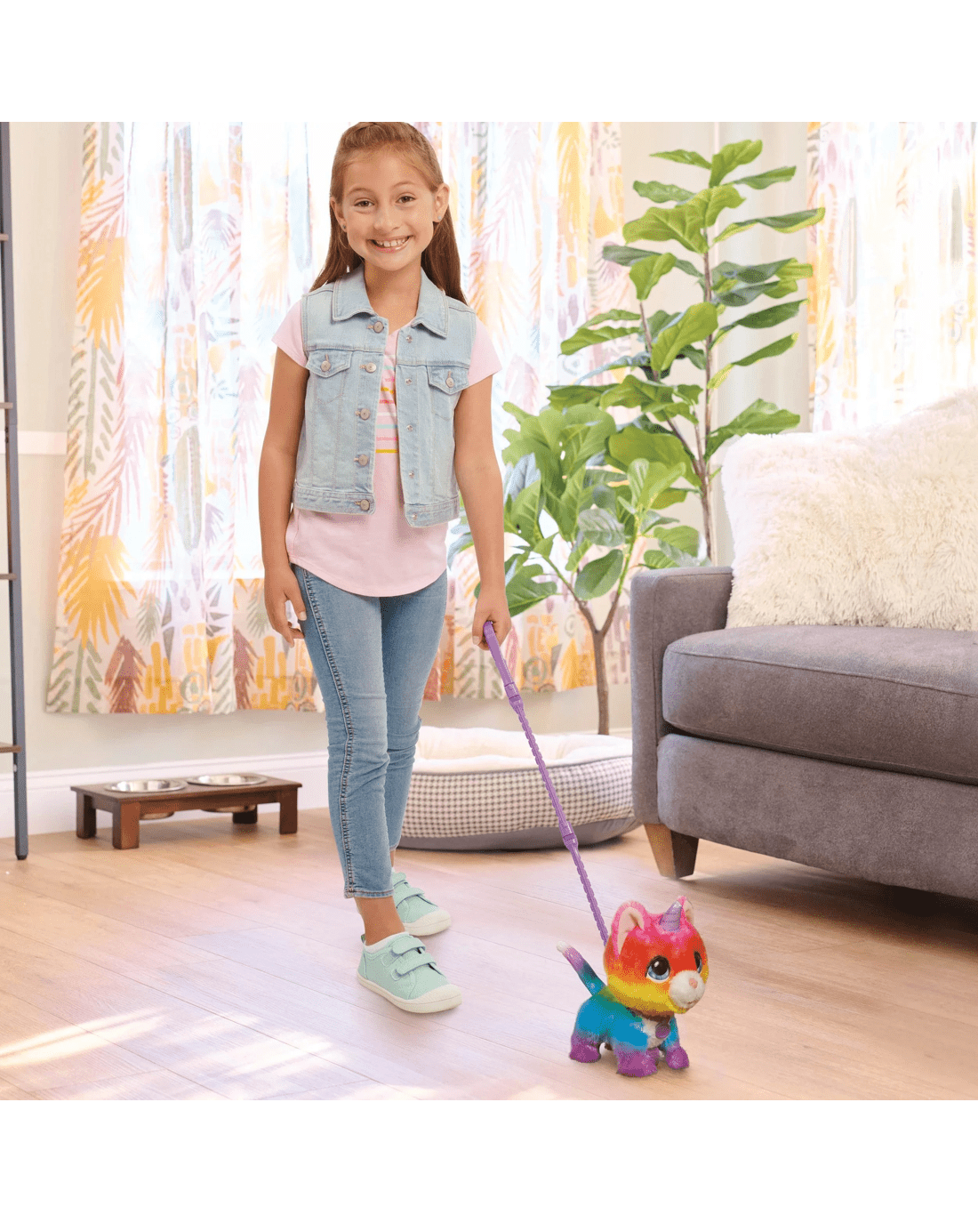 • Walk and talk: Connect this sweet unicorn cat’s collar to the leash and gently push her around the house to see its bouncy walk – complete with head wobble and adorable sound effects.