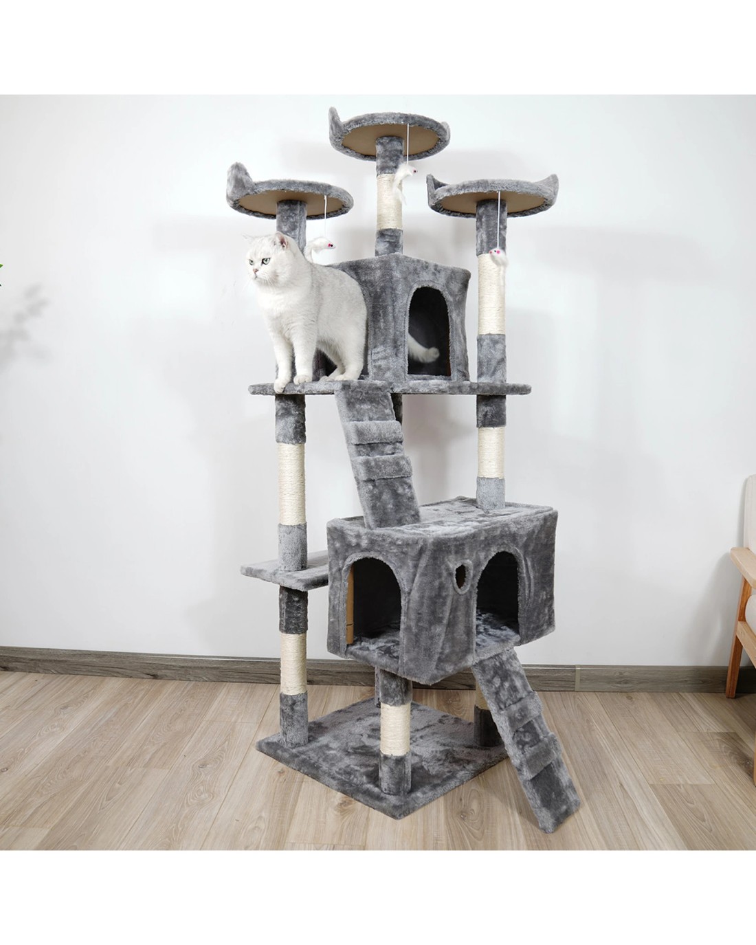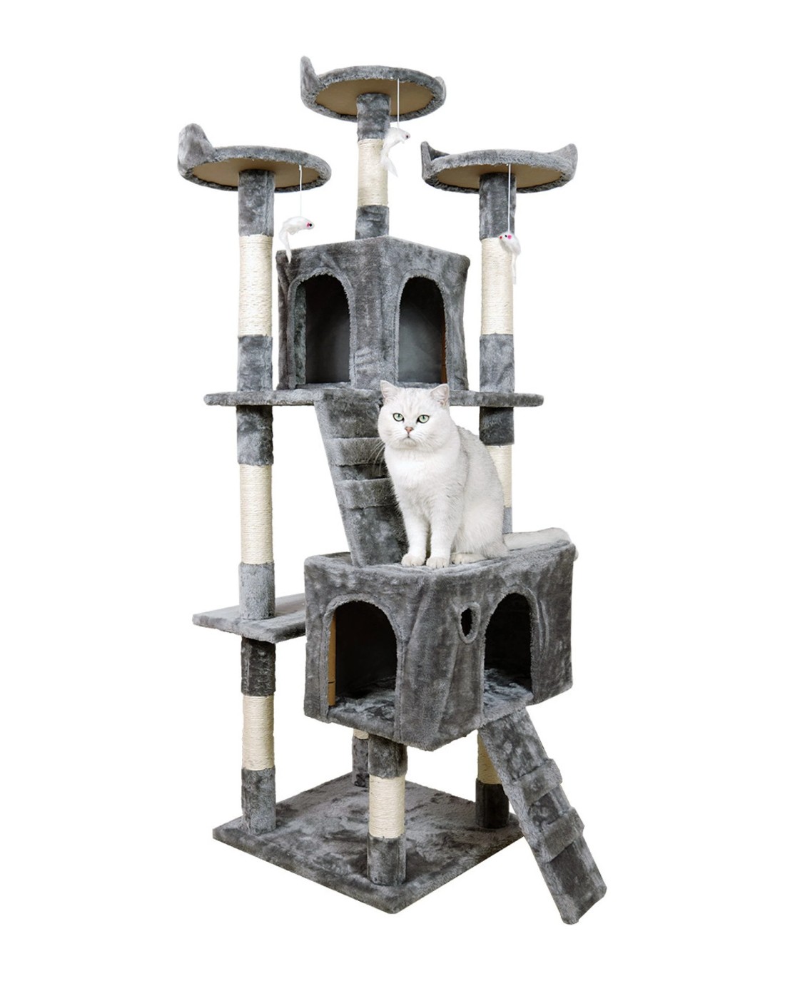 At 170cm tall, it features two cubby houses, two ramps and multiple shelves to perch, climb and nap on. The dangling toys right at the top provide a healthy outlet for your cats hunting instincts. And the built-in scratching posts will let your cats sharpen their claws without damaging your rugs or furniture.