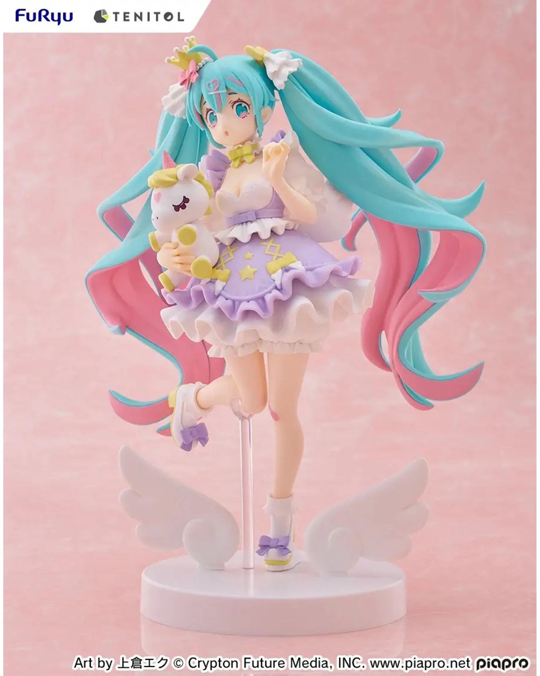 FuRyu's "TENITOL" figure of Hatsune Miku, "Dreamy Princess," is back in a new color! This figure is based on an original illustration by the popular artist Eku Uekara, and the coloring is based on the artist's original idea too, giving it an even dreamier atmosphere than before! The relaxing pastel colors make Miku even cuter than before, and the puff sleeves on her blouse use transparent parts! Her base is included. The ribbons, frills, crown and unicorn make this figure something you'll love to show off in your collection Ages 15 +