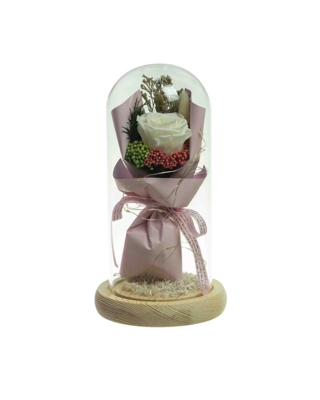 Fusion Preserved Dried Rose Flower 21cm Floral Set in Glass Dome w/ Fairy Lights in White Cream