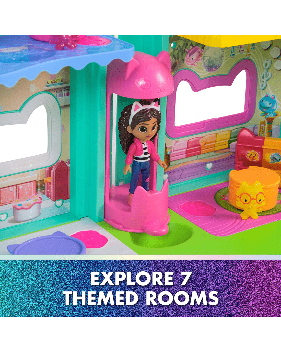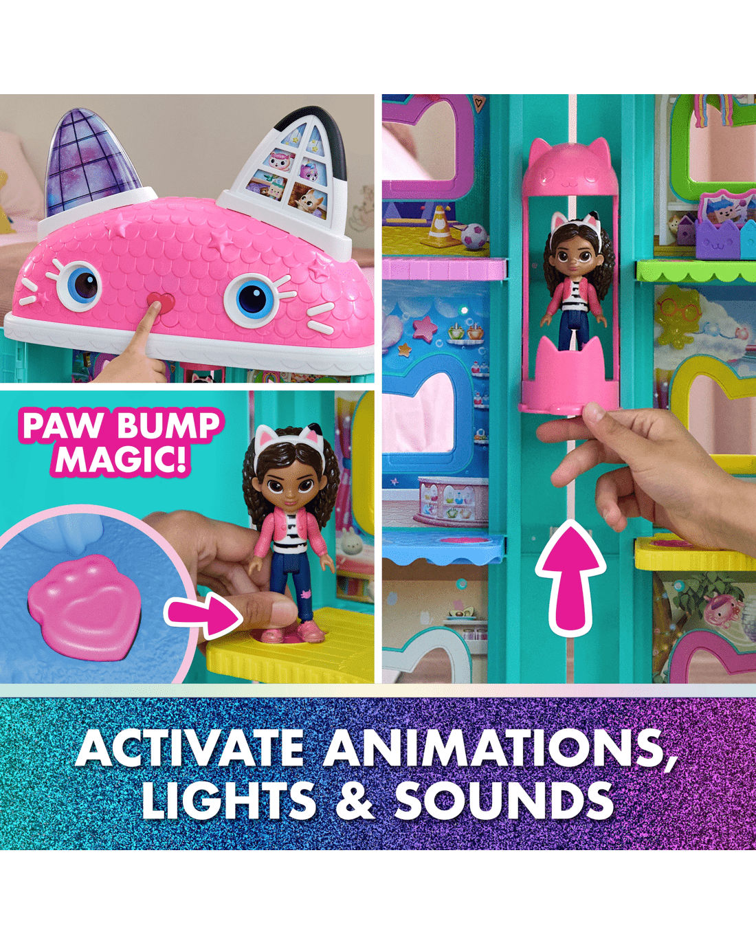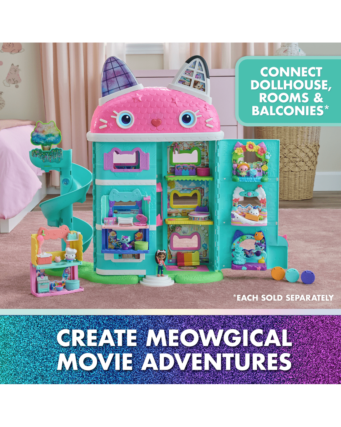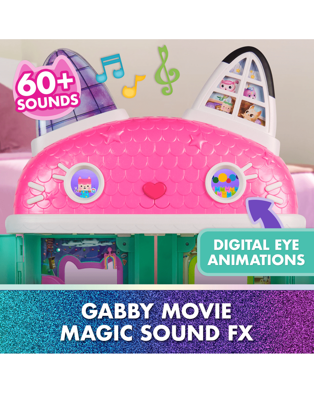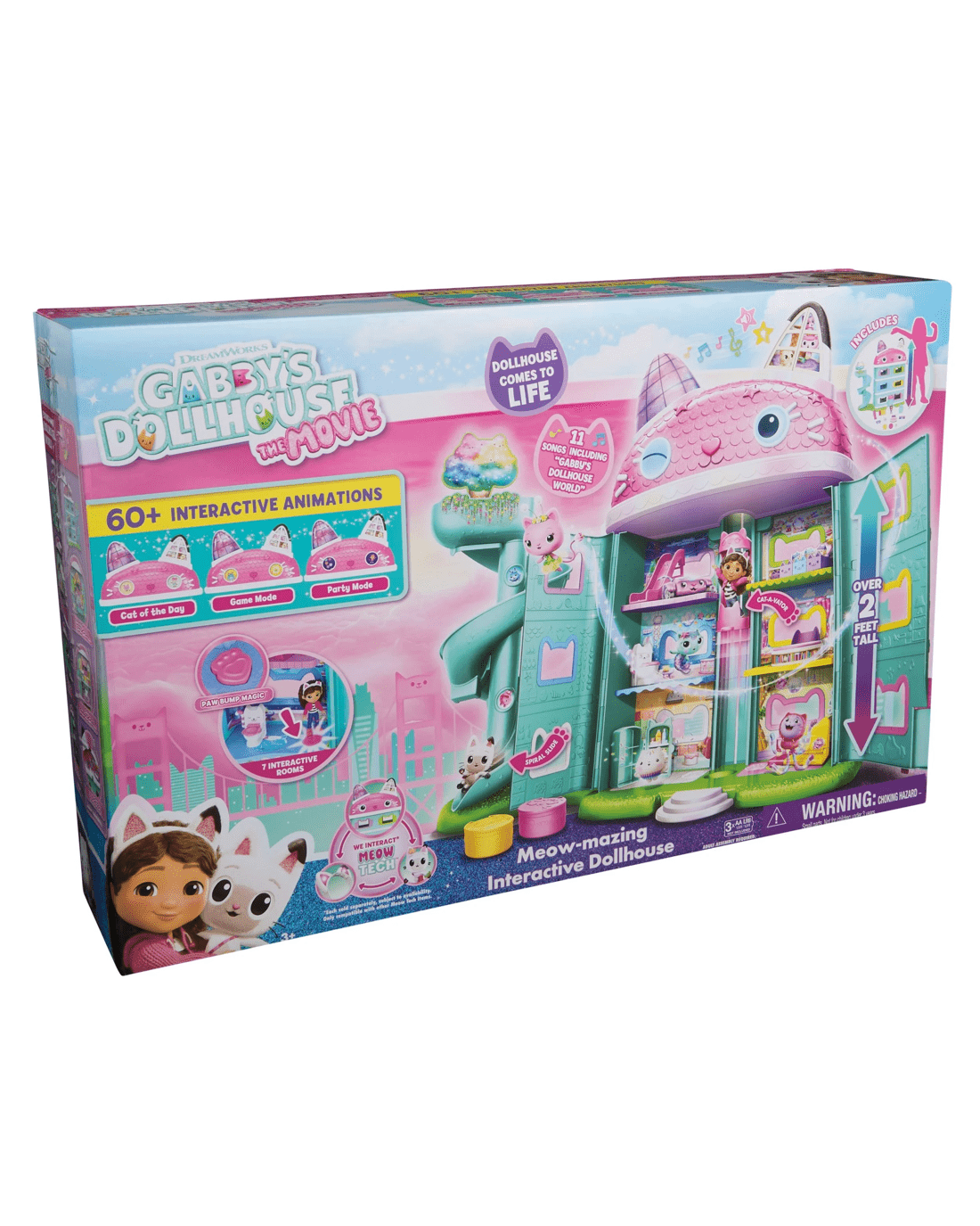 - Gabby Movie Magic: Gabby’s Meow-mazing Interactive Dollhouse is over 2 ft tall, features 7 interactive rooms, animated LCD screen eyes, a working Cat-a-vator, & a spiral slide for dollhouse deliveries