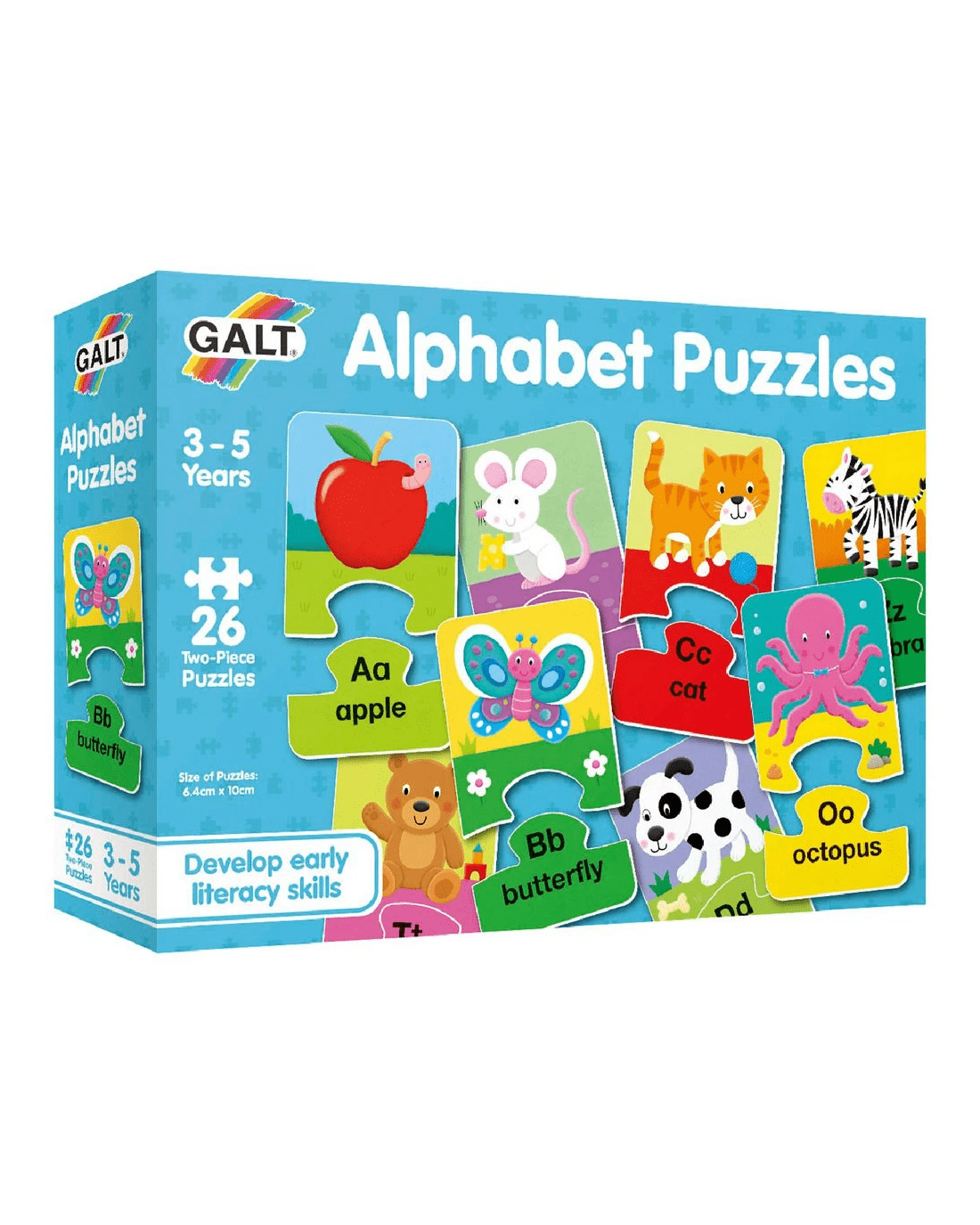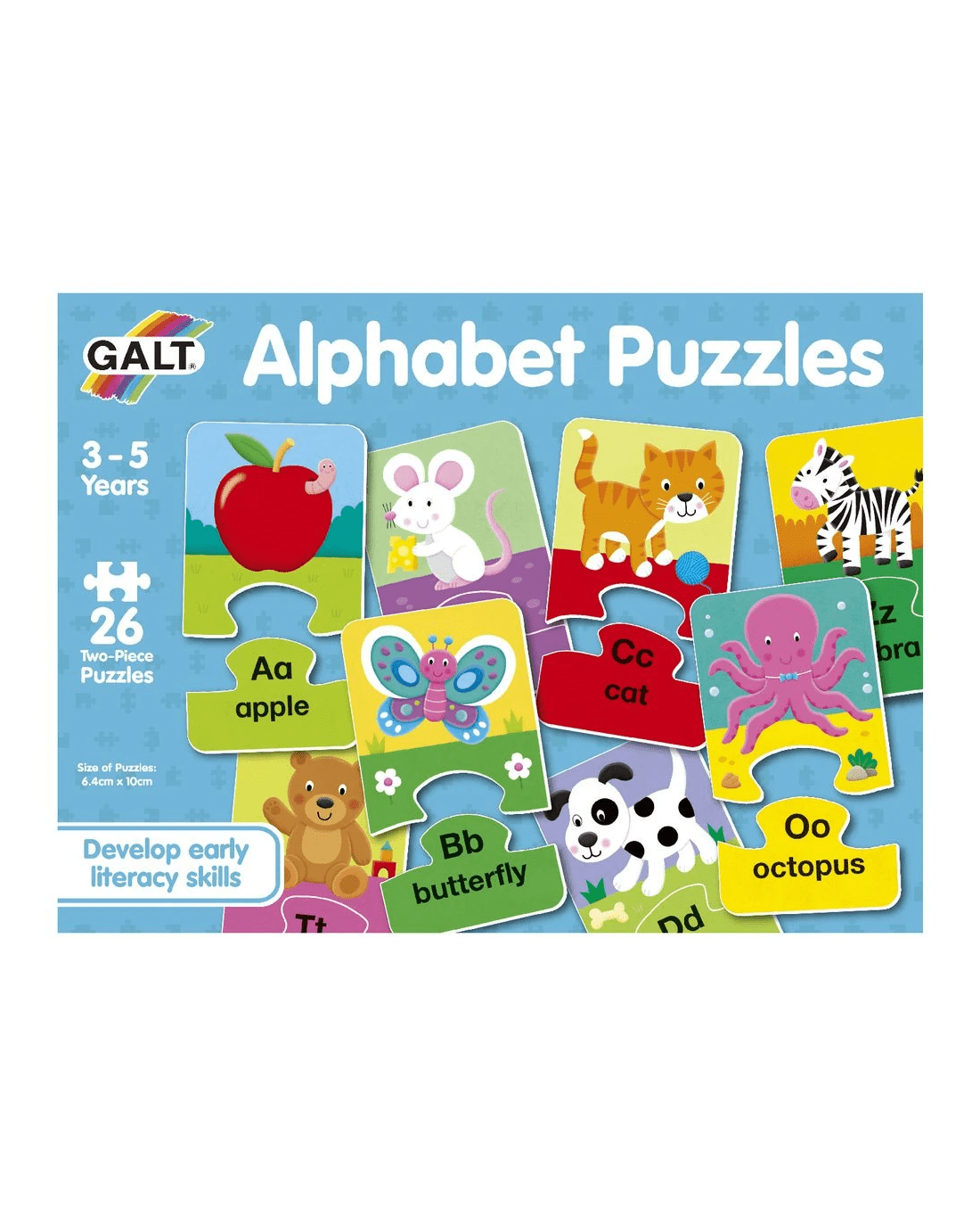 These Galt Alphabet Puzzles will help you to improve your matching skills and letter recognition. Each 2-piece puzzle features a picture to match its initial letter making it a great way to learn words and letters.