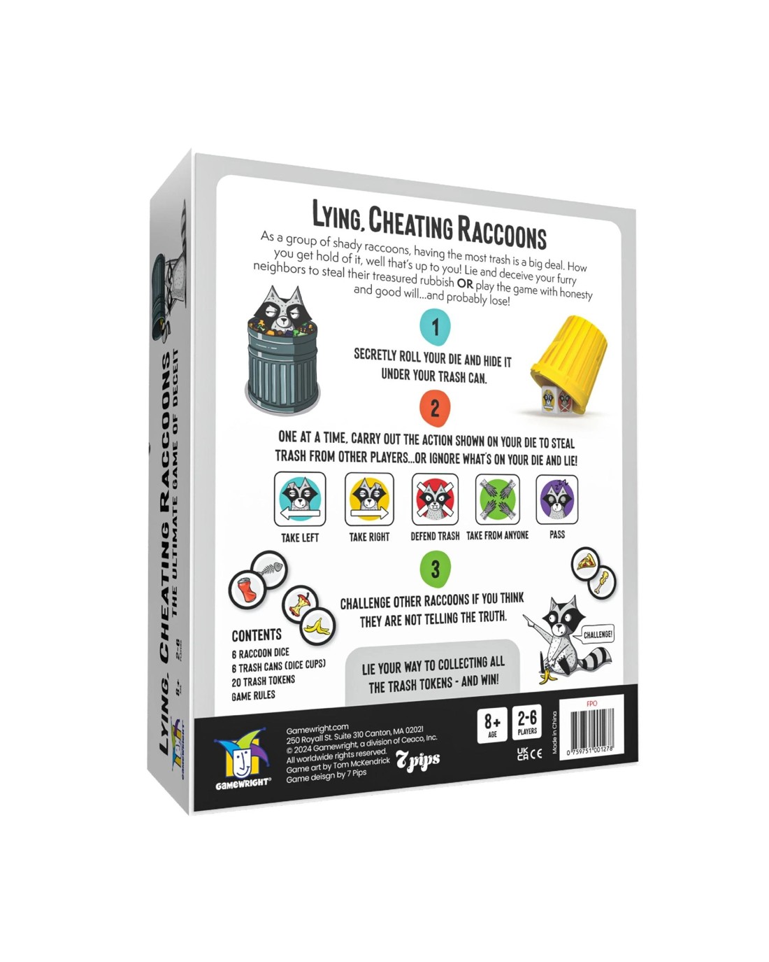 • A FAST-PACED GAME OF BLUFFING, STRATEGY, AND TRICKERY: Lying, Cheating Raccoons challenges players to outsmart their opponents using deception, distraction, and a bit of luck! Bluff about your die roll, steal tokens, and keep your true intentions hidden as you fight to become the raccoon with the most delicious trash treats.
