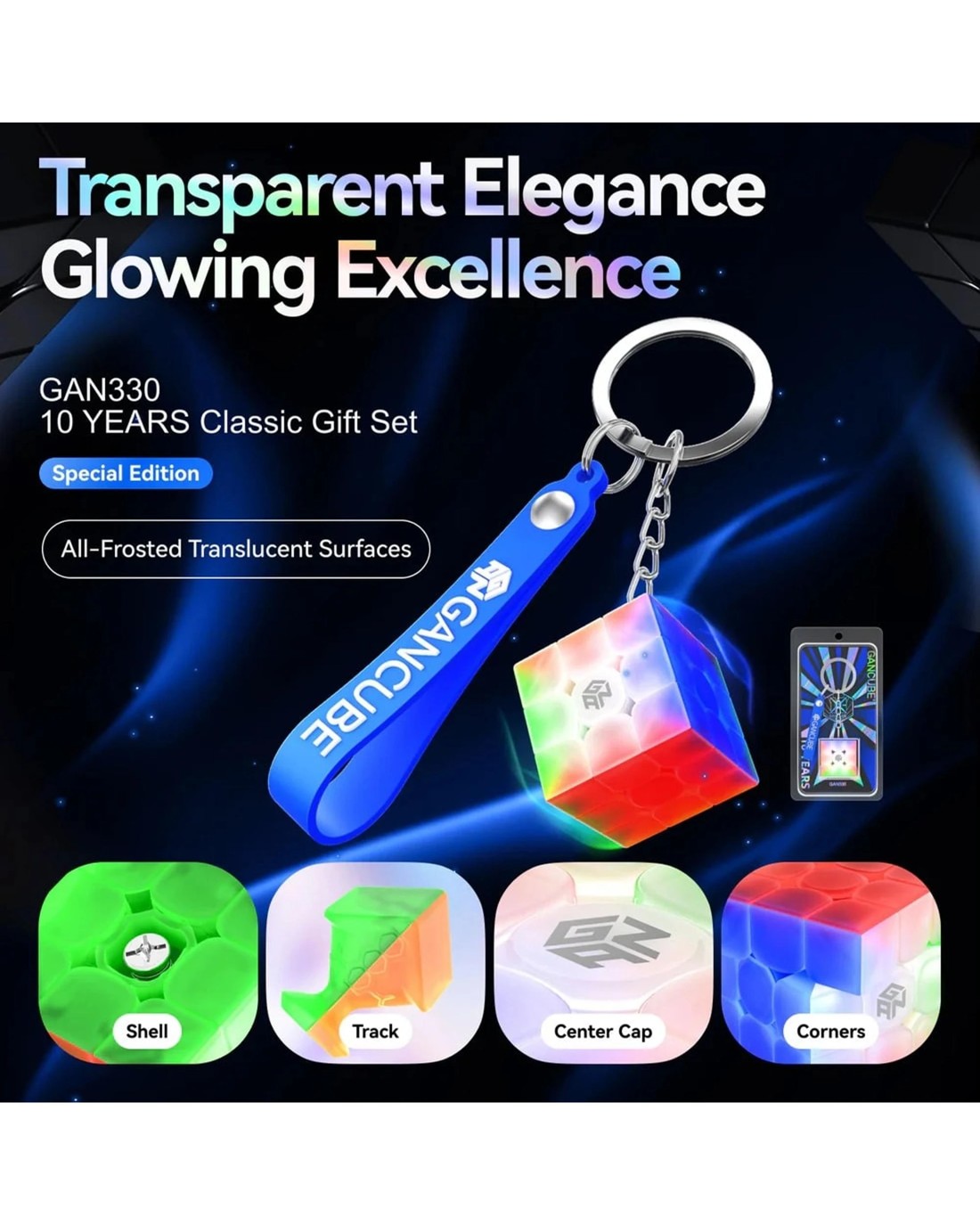 The GAN330 Keychain - 10 Years Special Edition - 3×3 Cube is a cool accessory and a convenient speed cube puzzle toy. Featuring a vibrant, transparent design and impressively smooth turning for its size, this cube offers a premium solving experience in a compact, portable form. It's a must-have for any cubing fan. Ages 8 +