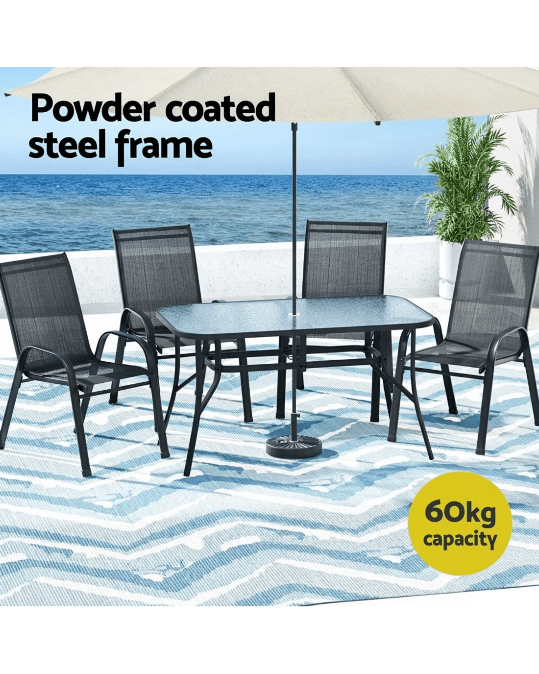 Upgrade your outdoor space with the Gardeon Dining Table, featuring a rust-resistant steel frame and shatterproof tempered glass top for durability. The built-in parasol hole lets you enjoy shade on sunny days, while anti-slip feet ensure stability on patios, poolside, or balconies. With 60kg capacity and easy wipe-clean surfaces, this table suits gatherings or daily meals. Choose from two sizes (Model:140cm/120cm) and assemble in minutes – no tools required!