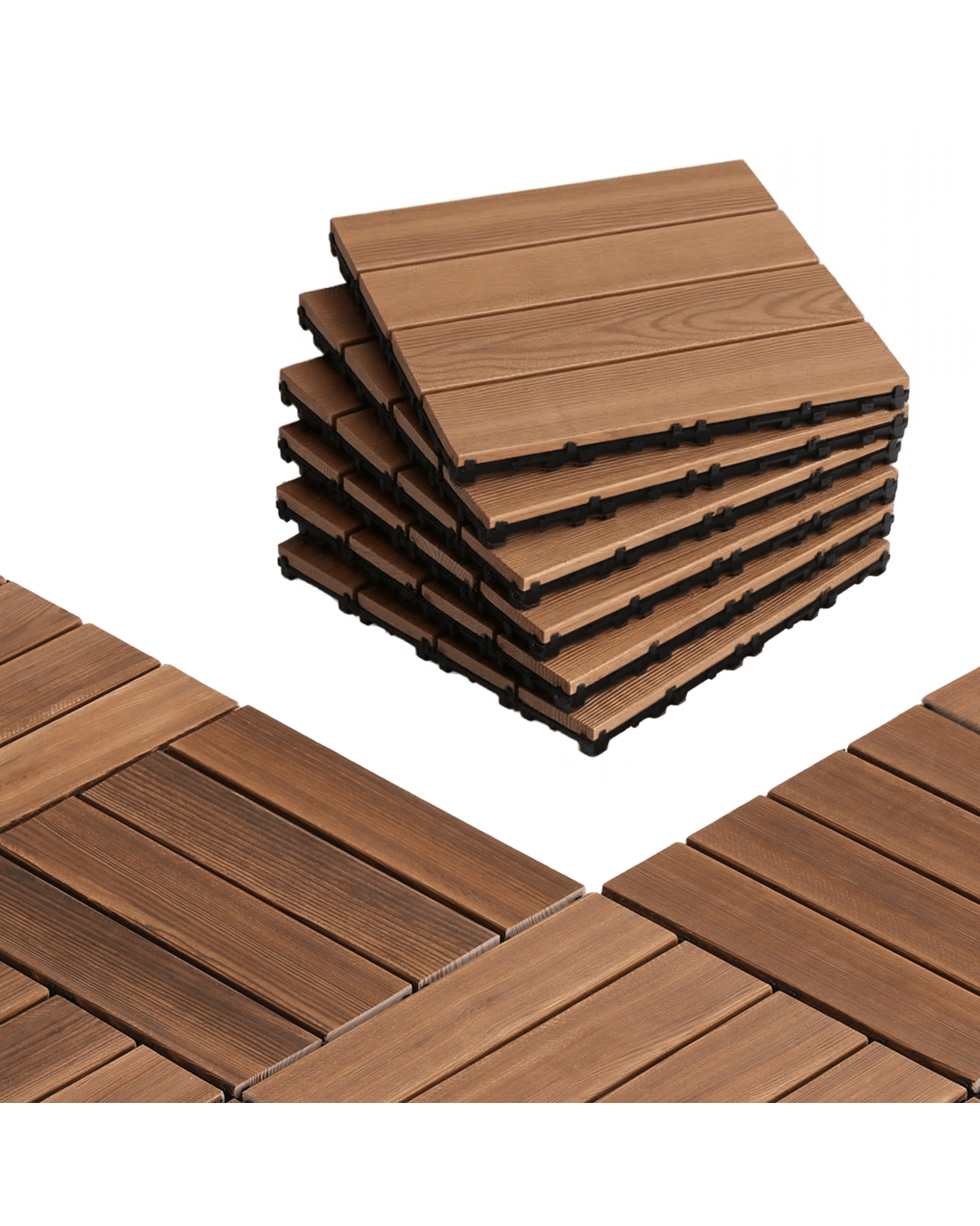 Upgrade your outdoor space with Gardeon Pine Wood Deck Tiles. This 27-pack set features natural pine wood in an easy interlocking design, perfect for creating an instant patio, balcony, or poolside area. The tiles allow for water drainage and provide a slip-resistant surface. Simply click them together for a tool-free installation that brings warmth and style to any setting.