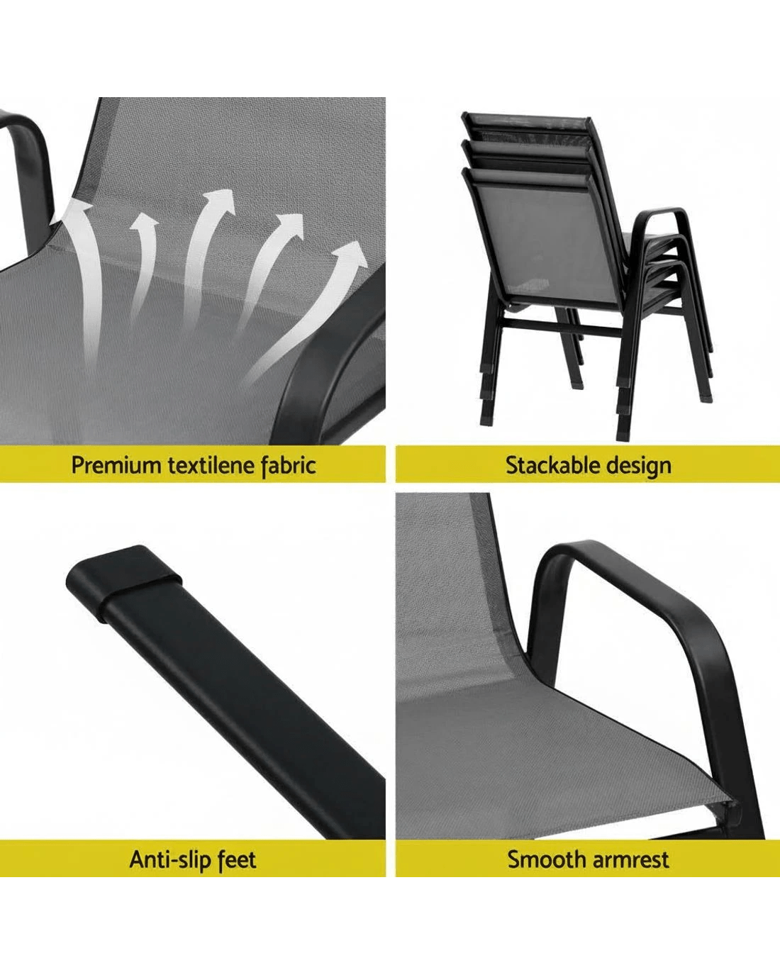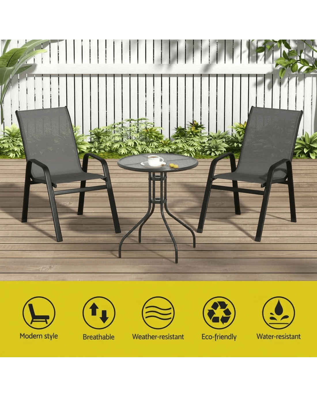 Whether you're hosting an outdoor intimate dinner party or barbeque night for your friends or family, the Gardeon outdoor stackable chair set is perfect to design a gorgeous outdoor setting that will wow your guests. The chairs are stackable, which makes for convenient and easy storage when not required. Designed for years of enjoyment, the chair set boasts classic looks and are made from premium textilene fabric and sturdy metal frame with durable powder coating. The anti-slip feet and good weather-resistance also makes them quite desirable. You can also pair this chair set with our sturdy and beautiful matching table to create a harmonious look.