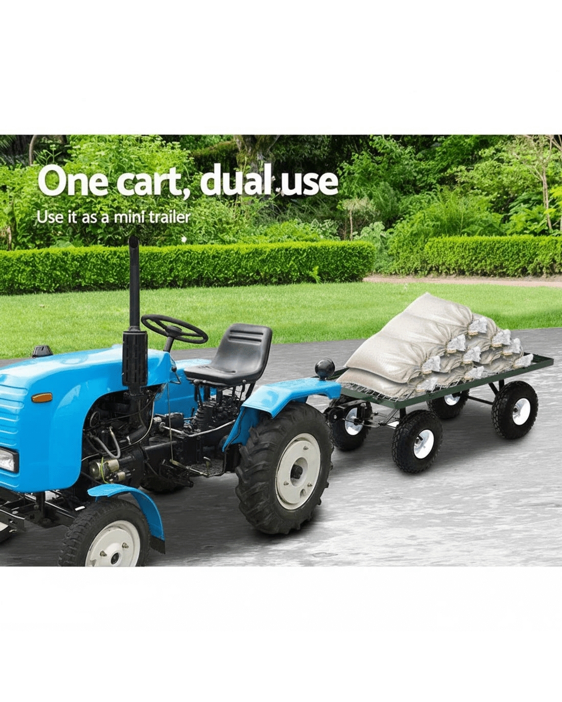 And as an added convenience, the Garden Cart can also be attached to an All-Terrain Vehicle (ATV) such as a riding lawn mower or yard tractor to tow grass cuttings or other gardening supplies and equipment.
